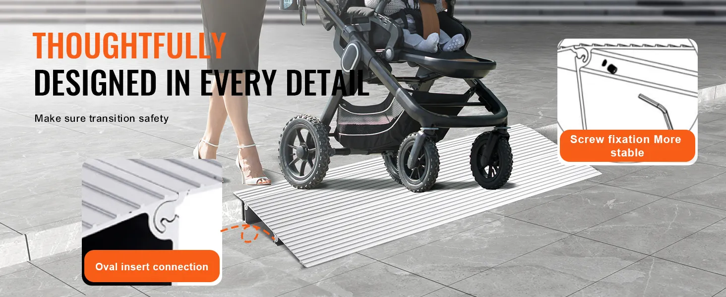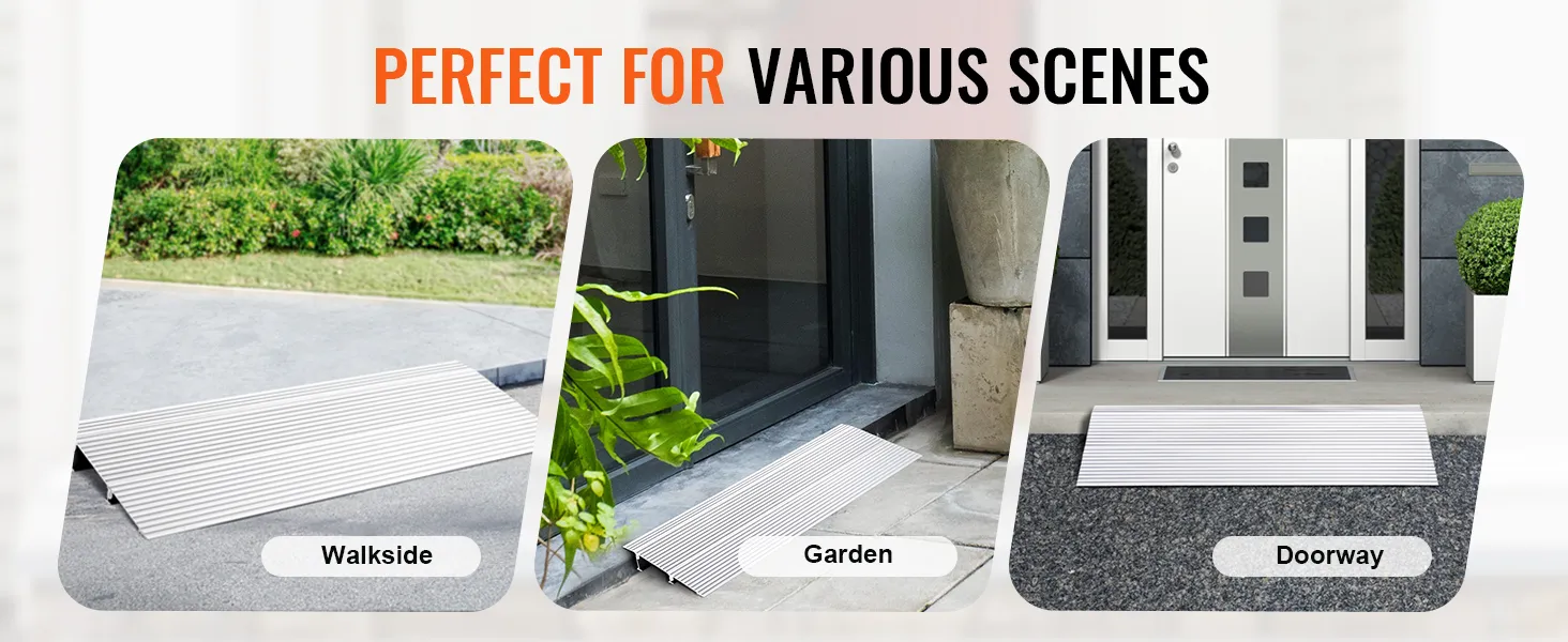 De VEVOR aluminium drempelhelling is ontworpen om kleine hoogteverschillen te overbruggen. Dit maakt hem ideaal voor gebruik in deuropeningen, over trappen of overal waar een soepele overgang nodig is. Het ontwerp van de helling zorgt ervoor dat hij deze hoogteverschillen efficiënt aankan. Het biedt een welsprekende en soepele overgang voor rolstoelen en scooters. Deze functie is essentieel voor mensen die hulp nodig hebben om van het ene niveau naar het andere te gaan. Onze helling vereenvoudigt deze overgangen en verbetert de algehele mobiliteit en onafhankelijkheid.