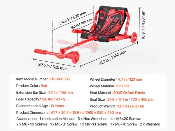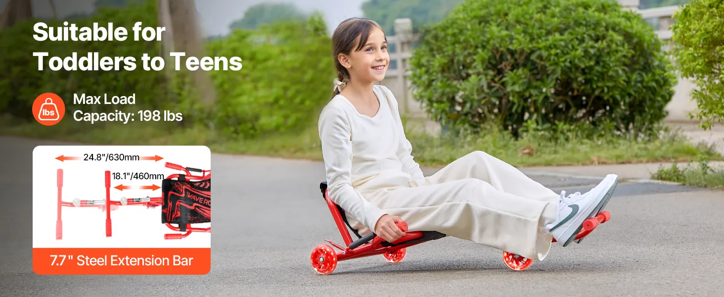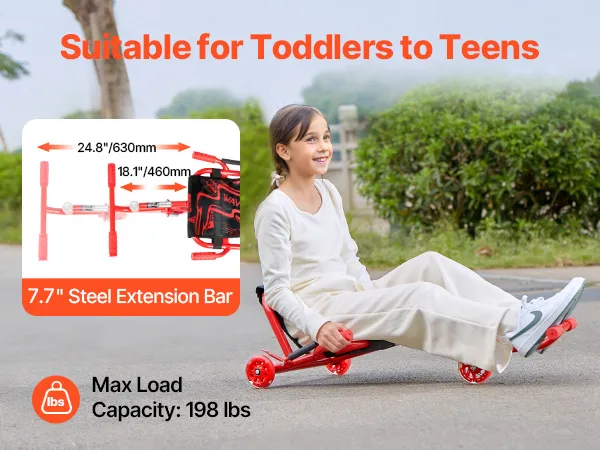 Two-length Options: We provide a sturdy 7.7 inches steel extension bar that allows you to easily extend the car's length from 41.7 inches to 49.4 inches with a simple screw fastening action. Thus, the ride on scooter can adapt to your child's varying ages and heights. Suitable for children aged 10 and up, with a maximum weight capacity of 198 lbs, it can be used from teens to adults.