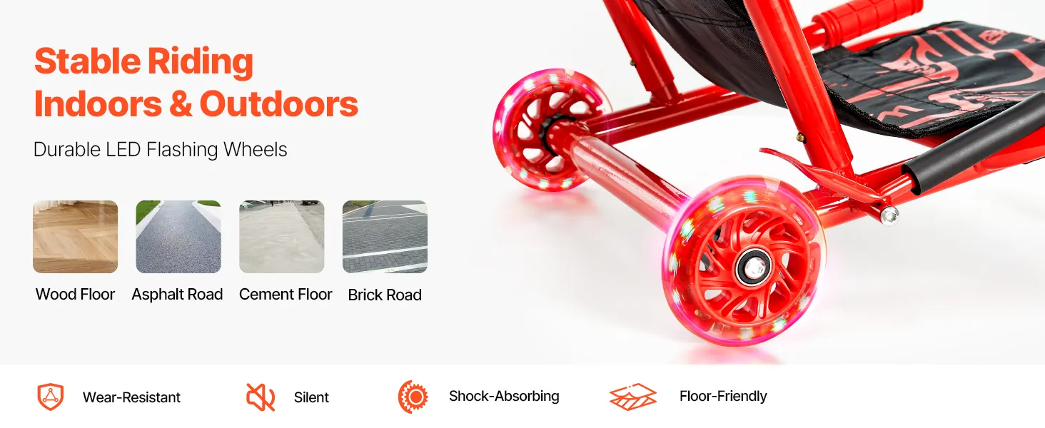 Cool LED Flashing Wheels: To enhance the fun of riding, we have specially designed colorful flashing wheels for the wiggle scooter that require no batteries—just spin the wheels to light them up! Made from durable PU and PP materials, the wheels are wear-resistant, silent, and absorb vibrations. You can ride on any smooth, hard surface, including indoor wood floors, outdoor asphalt, cement floors, and brick paths, without scratching like plastic, avoiding those heartbreaking marks.