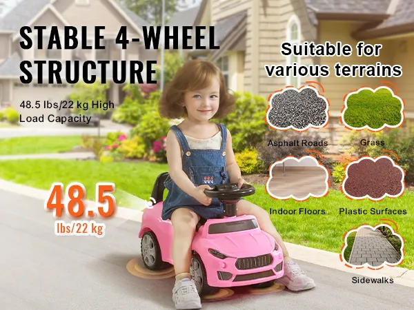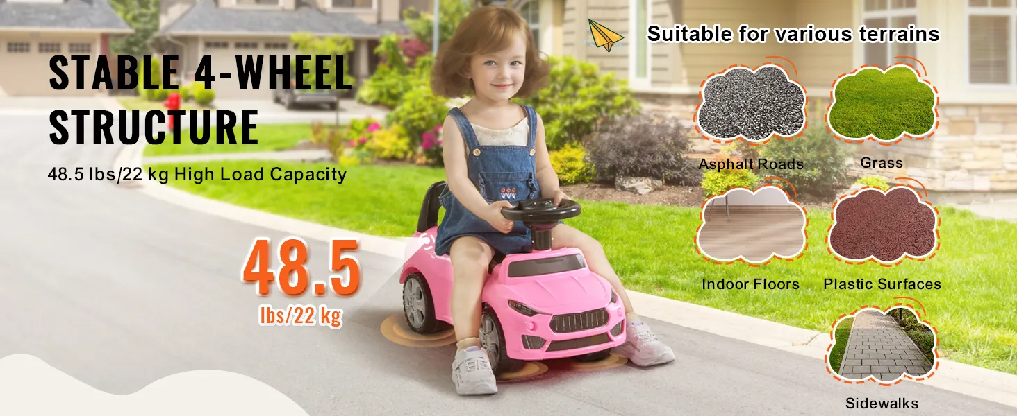 48.5 lbs/22 kg Strong Load Capacity: Made from tough, impact-resistant PP material and with a sturdy four-wheel design, this toddler ride on car can support up to 48.5 lbs/22 kg. It's built to last and give your kid endless fun.