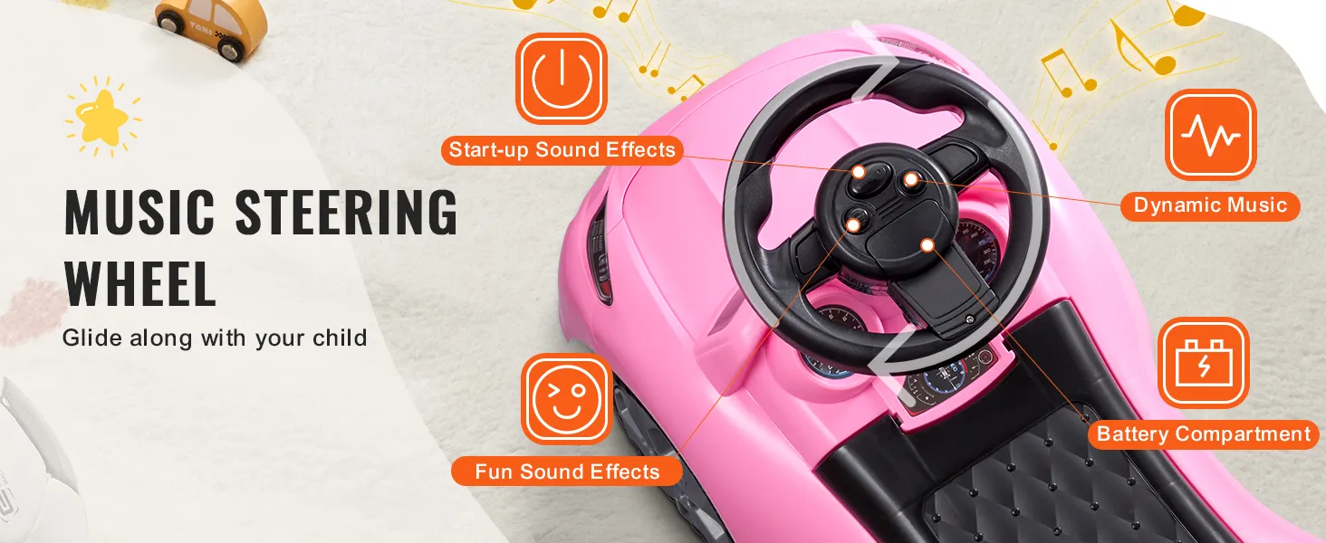 Dynamic Car Music: Our toddler ride on toy's steering wheel plays cheerful kids' songs with just a press of a button, adding extra joy to playtime. Plus, the smooth design of the steering wheel makes it easy and comfy for your kid to steer.