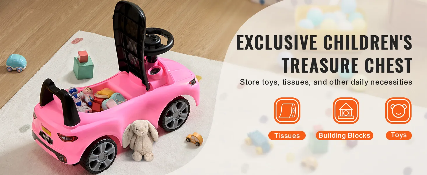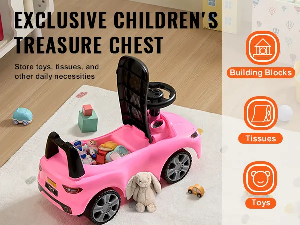 Built-in Hidden Storage Space: The toddler riding car features a handy storage compartment under the seat, ideal for storing toys, water bottles, tissues, and more while out and about. It's a great way to help your kid learn to keep things tidy.