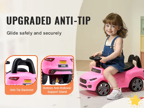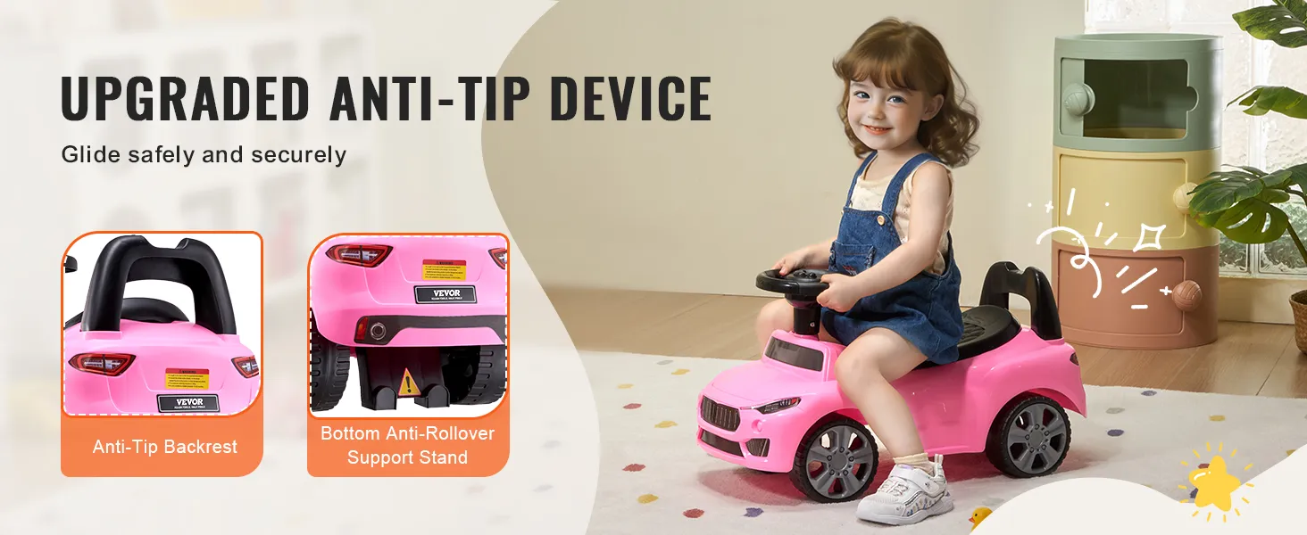 This ride on toddler car has a backrest and anti-tip support bar to prevent tipping, making sure your kid stays safe while playing.