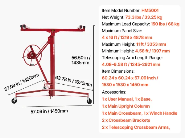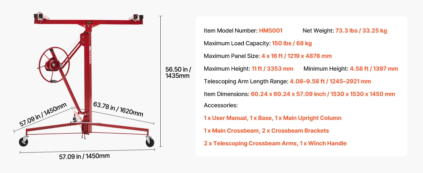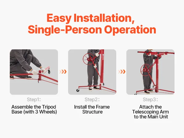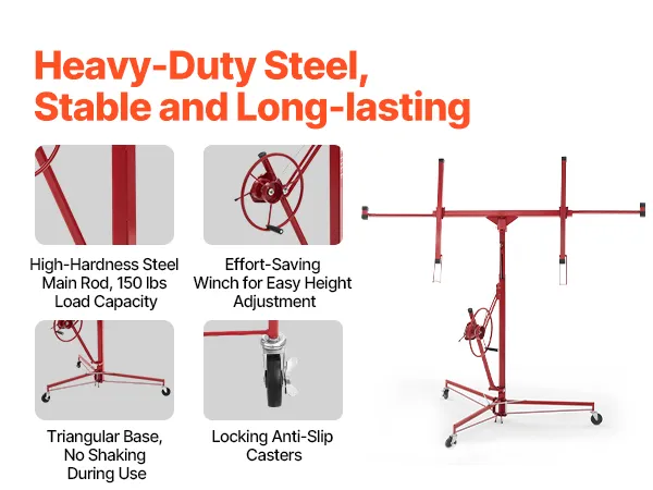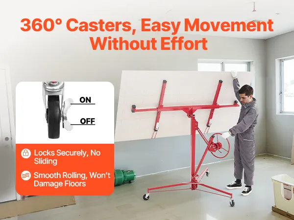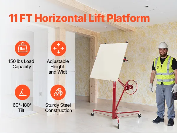 Verstelbare hoogte en lengte: De telescopische arm heeft een lengtebereik van 1245–2921 mm (4,09–9,58 ft), ideaal voor het monteren van gipsplaten. De gipsplaatlift kan een hoogte van 3353 mm (11 ft) bereiken en helpt u bij het bevestigen van gipsplaten aan het plafond.