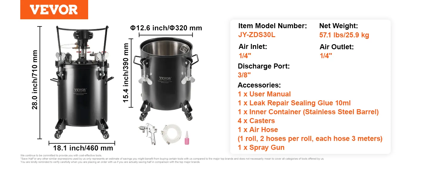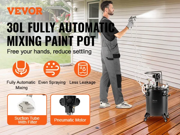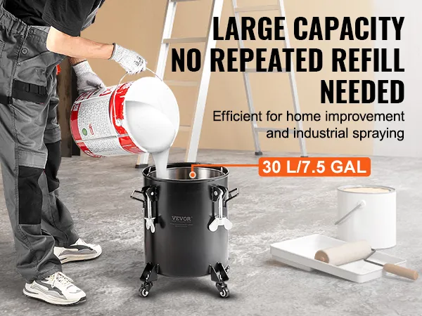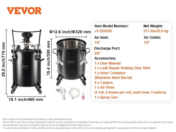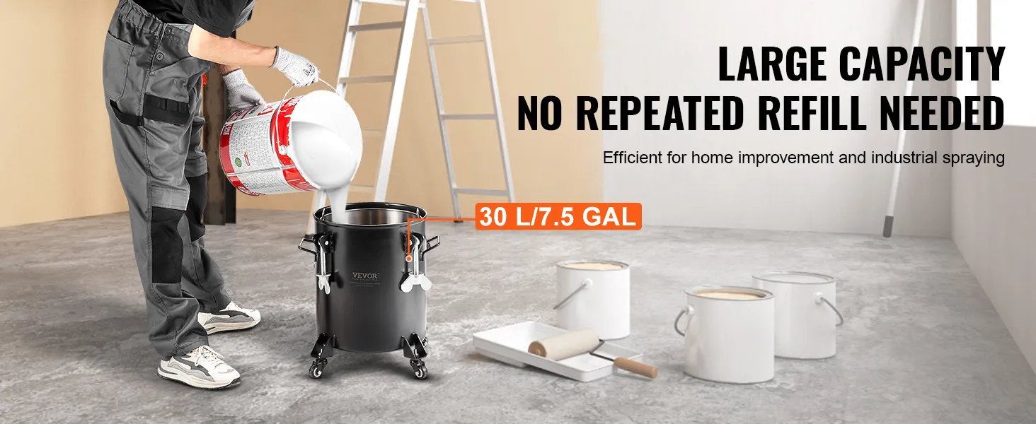 Capaciteit van 30 liter: de spuitverfdrukcontainer heeft een capaciteit van 30 liter, met inlaat- en uitlaatdiameters van 1/4 inch en een vloeistofuitlaatdiameter van 3/8 inch. Met deze extra grote capaciteit kunt u efficiënt schilderklussen uitvoeren aan de buitenkant van gebouwen, hekken, boten, huisdecoraties en meer, zonder dat u regelmatig verf hoeft bij te vullen.