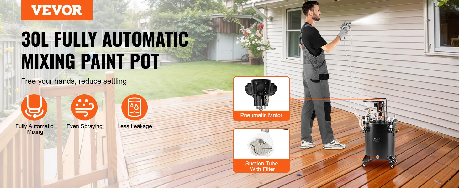 Automatisch roeren: De verfcontainer is voorzien van een pneumatische roermotor, die zorgt voor een gelijkmatige menging van de verf en voorkomt dat de verf indikt en bezinkt. Handmatig roeren is niet nodig, waardoor een efficiënte werking mogelijk is. De zuigslang is voorzien van een filter dat verontreinigingen effectief tegenhoudt en verstopping van pistool en slang voorkomt.