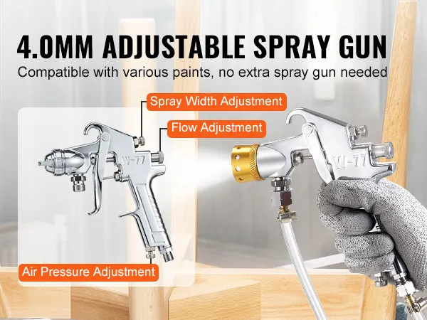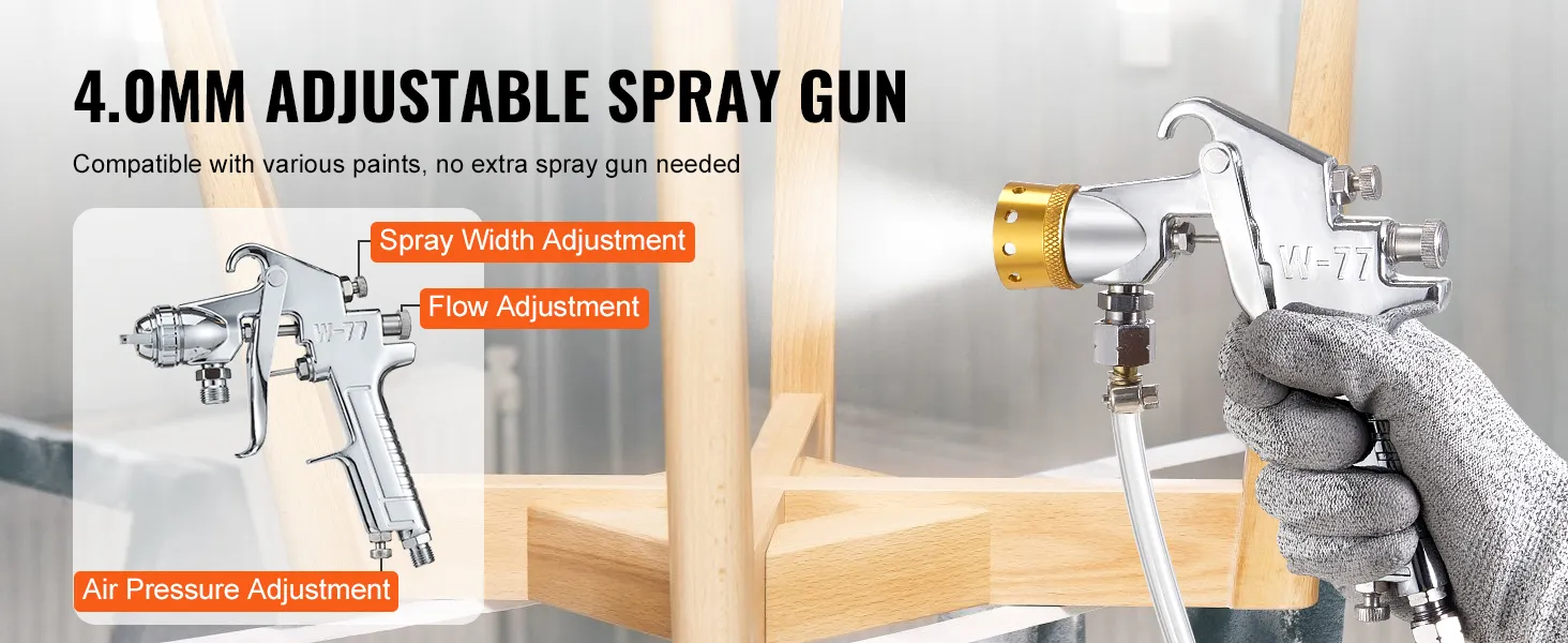 Het spuitpistool is geschikt voor gangbare verven zoals latex-, zand- en metallic verven op waterbasis. Hij beschikt over drie verstelbare knoppen om de luchtdruk, de hoeveelheid verf en het spuitpatroon te regelen, waardoor een gelijkmatig, waaiervormig spuitpatroon wordt bereikt.
