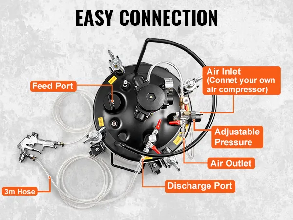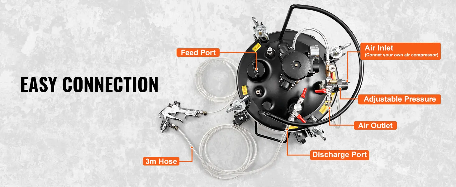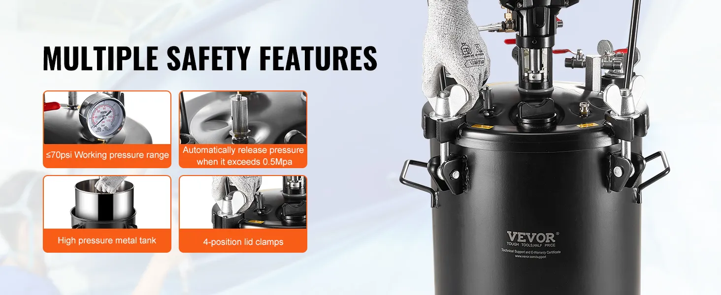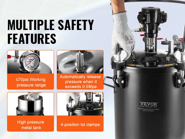 Verbeterde dichtheid: de verfdruktank heeft een binnenbekleding en een buitenlaag van hogedruk-slagvast metaalstaal. De emmeropening is voorzien van een rubberen afdichting en vier veiligheidssloten om een goede afdichting te garanderen. Er wordt ook een kit meegeleverd om lekkages te repareren. Elke eenheid wordt getest op lekkage voordat deze de fabriek verlaat, om er zeker van te zijn dat er geen gaslekken zijn.