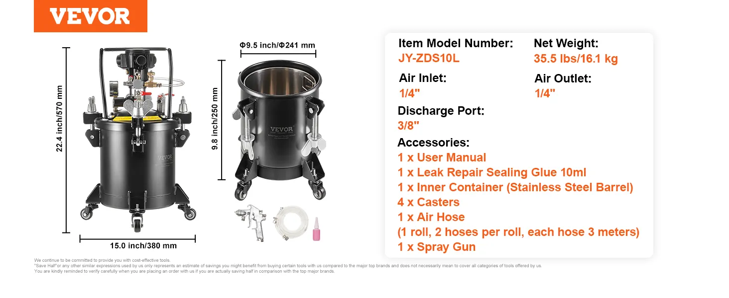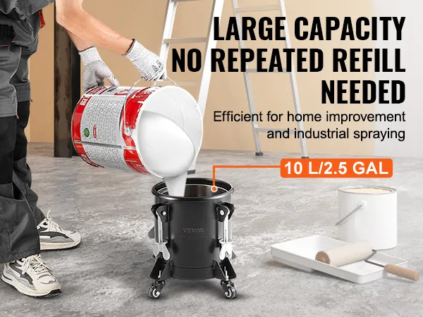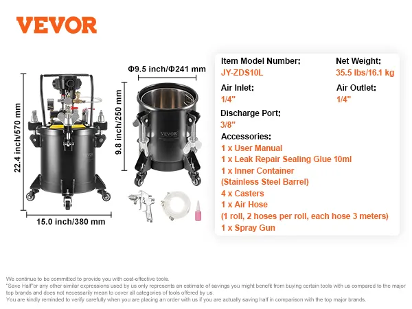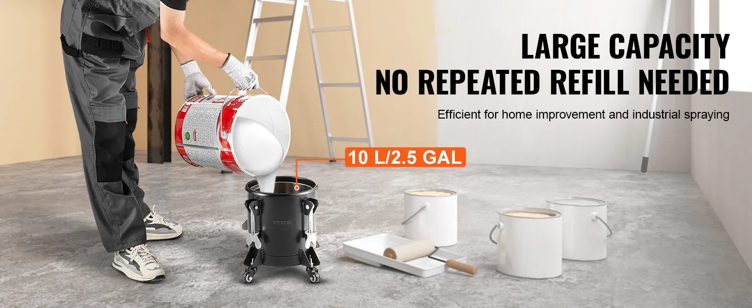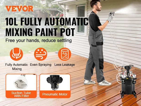 Grote capaciteit van 10 l: de spuitverfdruktank heeft een capaciteit van 2,5 gal (10 l), met een inlaat- en uitlaatdiameter van 1/4 inch (6,35 mm) en een vloeistofuitlaatdiameter van 3/8 inch (9,5 mm). Met deze extra grote capaciteit kunt u op efficiënte wijze schilderklussen uitvoeren aan de buitenkant van gebouwen, buitenhekken, boten, woningdecoraties en meer, zonder dat u regelmatig verf hoeft bij te vullen.