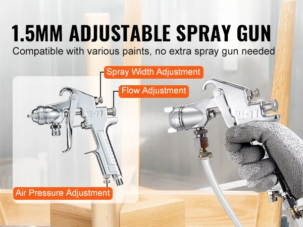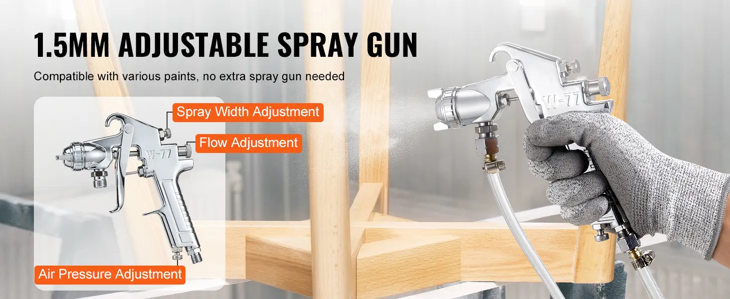 Het spuitpistool is geschikt voor gangbare verven zoals latex-, zand- en metallic verven op waterbasis. Hij beschikt over drie verstelbare knoppen om de luchtdruk, de hoeveelheid verf en het spuitpatroon te regelen, waardoor een gelijkmatig, waaiervormig spuitpatroon wordt bereikt.