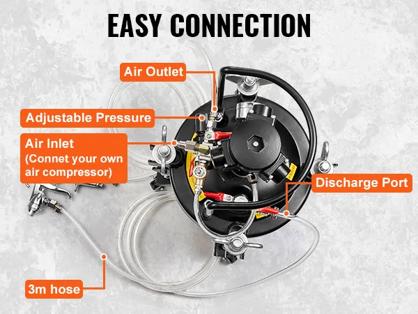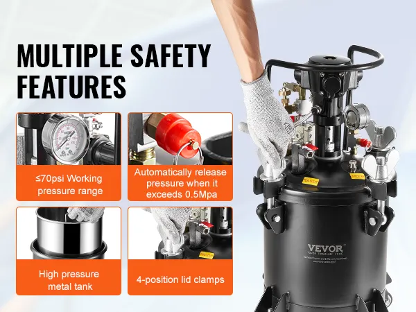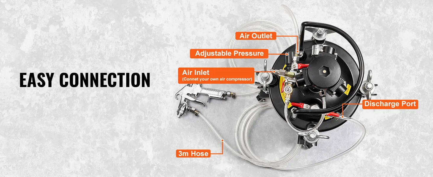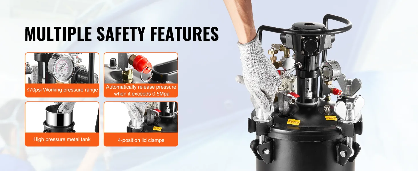 Verbeterde dichtheid: de verfdruktank heeft een binnenbekleding en een buitenlaag van hogedruk-slagvast metaalstaal. De emmeropening is voorzien van een rubberen afdichting en vier veiligheidssloten om een goede afdichting te garanderen. Er wordt ook een kit meegeleverd om lekkages te repareren. Elke eenheid wordt getest op lekkage voordat deze de fabriek verlaat, om er zeker van te zijn dat er geen gaslekken zijn.