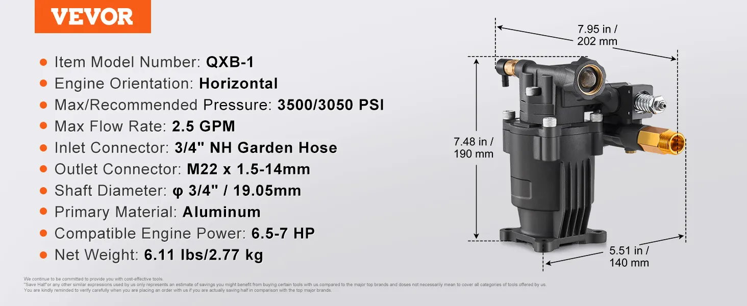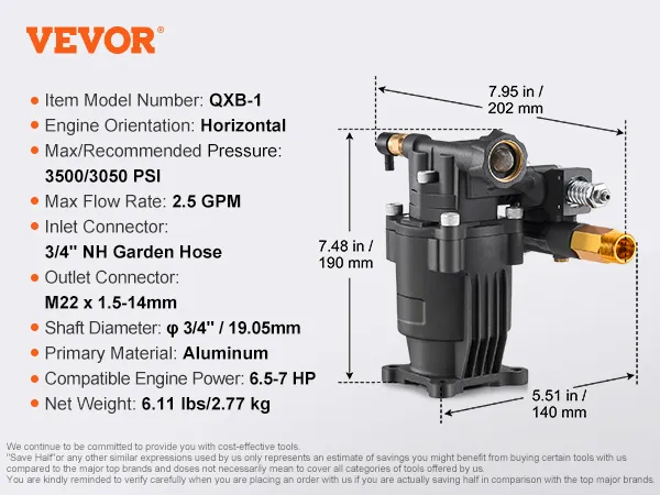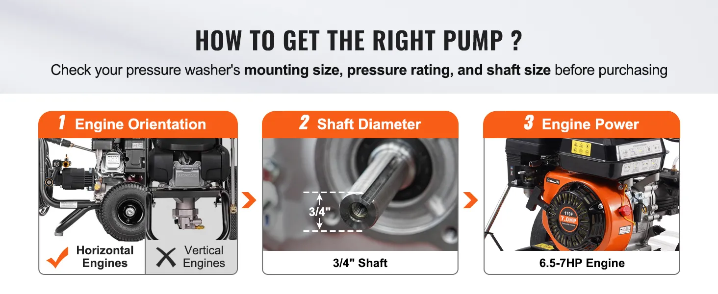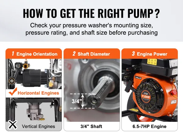 Sterke compatibiliteit: ontworpen voor 3/4" motoren met horizontale as, deze hogedrukreinigerpomp past op de meeste 208-220cc 6,5-7,0 pk-motoren met een standaard SAE-boutpatroon, waardoor het vervangen van de pomp eenvoudig en efficiënt is.
