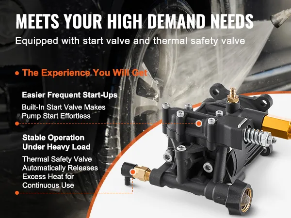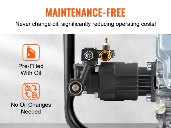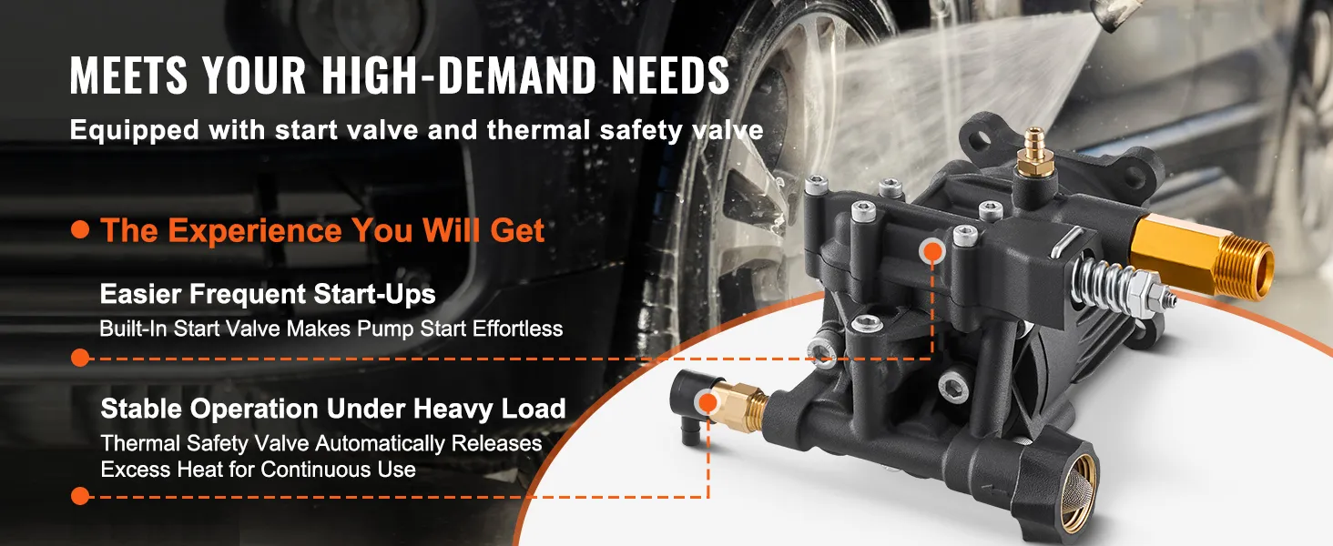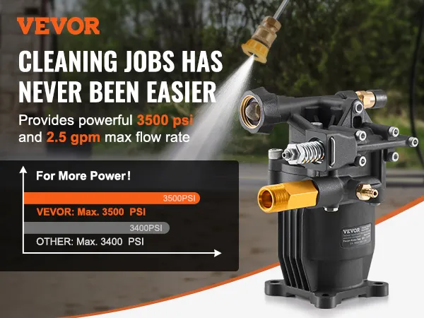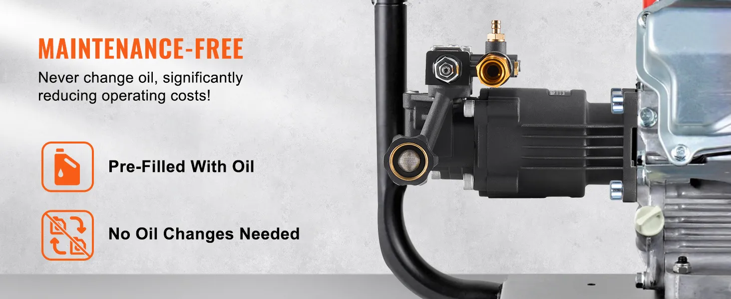 Onderhoudsvrij ontwerp: deze vervangingspomp voor hogedrukreinigers heeft een onderhoudsvrij carter, waardoor olieverversingen overbodig zijn. Ideaal voor elektrische reinigers van 2500-3400 PSI en 2,5 GPM, perfect voor het reinigen van muren, hekken, trottoirs, voertuigen en meer.