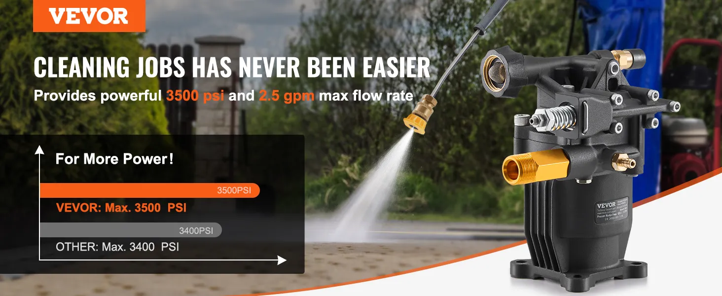 Zeer efficiënte reinigingsprestaties: onze hogedrukreinigerpomp levert een krachtige waterdruk tot 3500 PSI bij een maximaal debiet van 2,5 GPM, waardoor een snelle voltooiing van verschillende reinigingstaken wordt gegarandeerd, van huishoudelijk tot commercieel gebruik. (Aanbevolen werkdruk: 3050 PSI om de levensduur te verlengen.)
