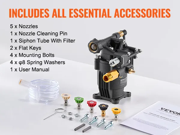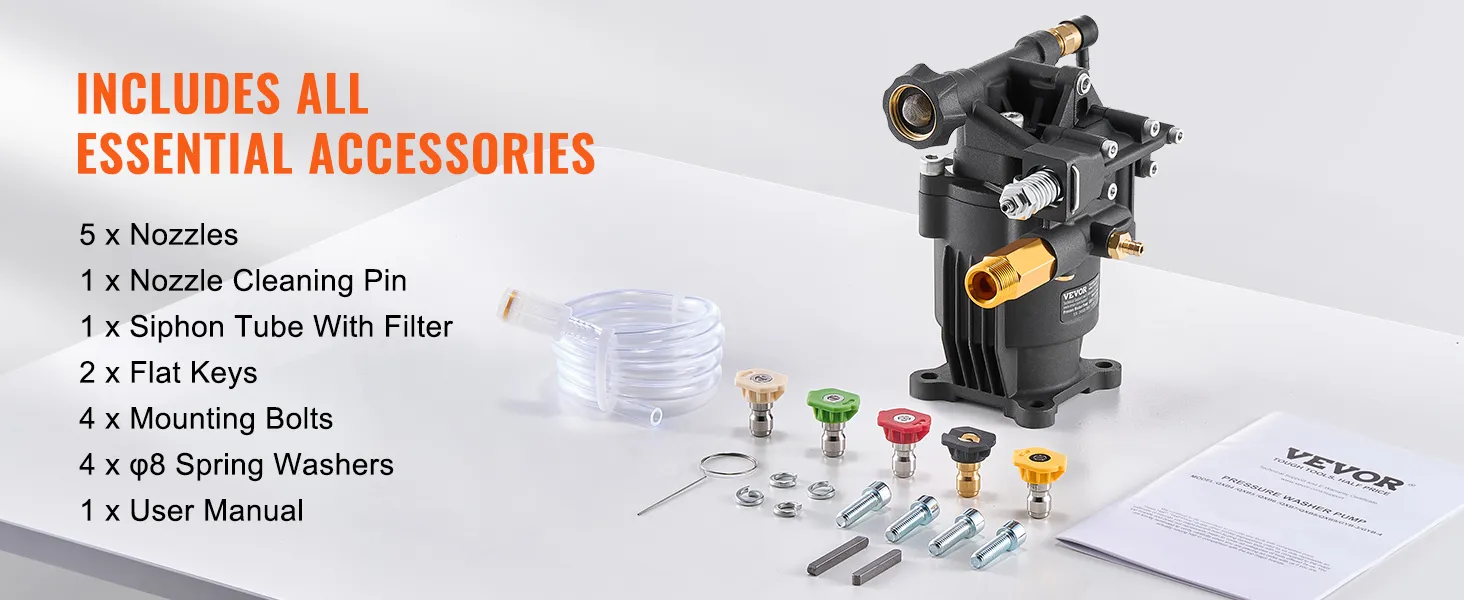 Uitgebreid assortiment accessoires: De vervangingspomp voor de hogedrukreiniger wordt geleverd met 5 sproeiers voor verschillende reinigingstaken. Elke set bevat 1 x spuitmondreinigingspen, 1 x sifonbuis, 2 x steeksleutels, 4 x 8 mm veerringen en 4 x M8*25 mm zeskantschroeven.
