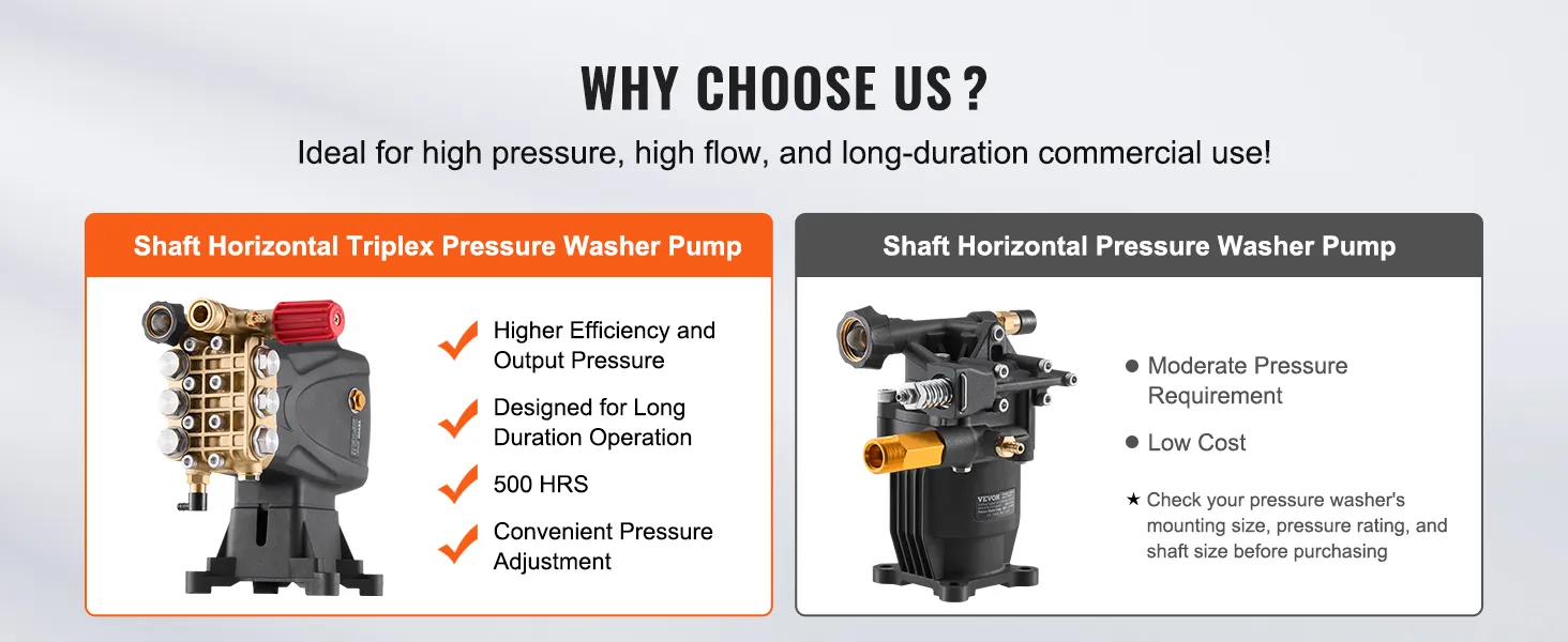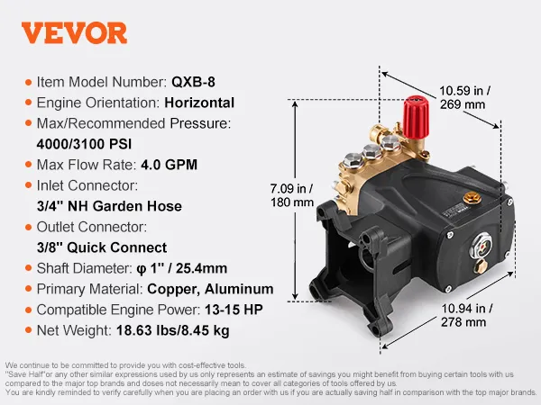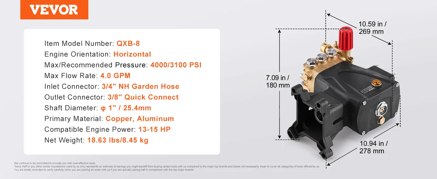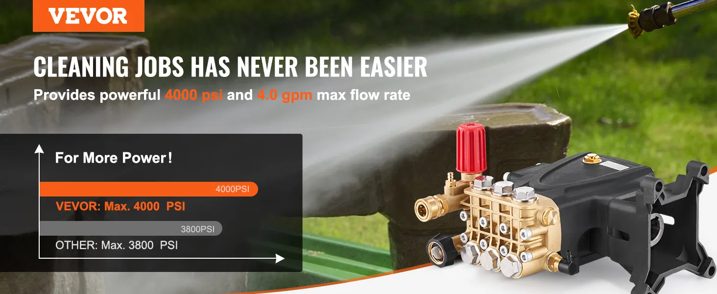 Zeer efficiënte reinigingsprestaties: onze hogedrukreinigerpomp levert een krachtige waterdruk tot 4000 PSI bij een maximale stroomsnelheid van 4,0 GPM, waardoor een snelle voltooiing van taken wordt gegarandeerd, van huishoudelijke schoonmaakwerkzaamheden tot licht industriële klussen. (Aanbevolen werkdruk: 3100 PSI voor typische huishoudelijke en licht industriële reiniging en om de levensduur van de pomp te verlengen.)
