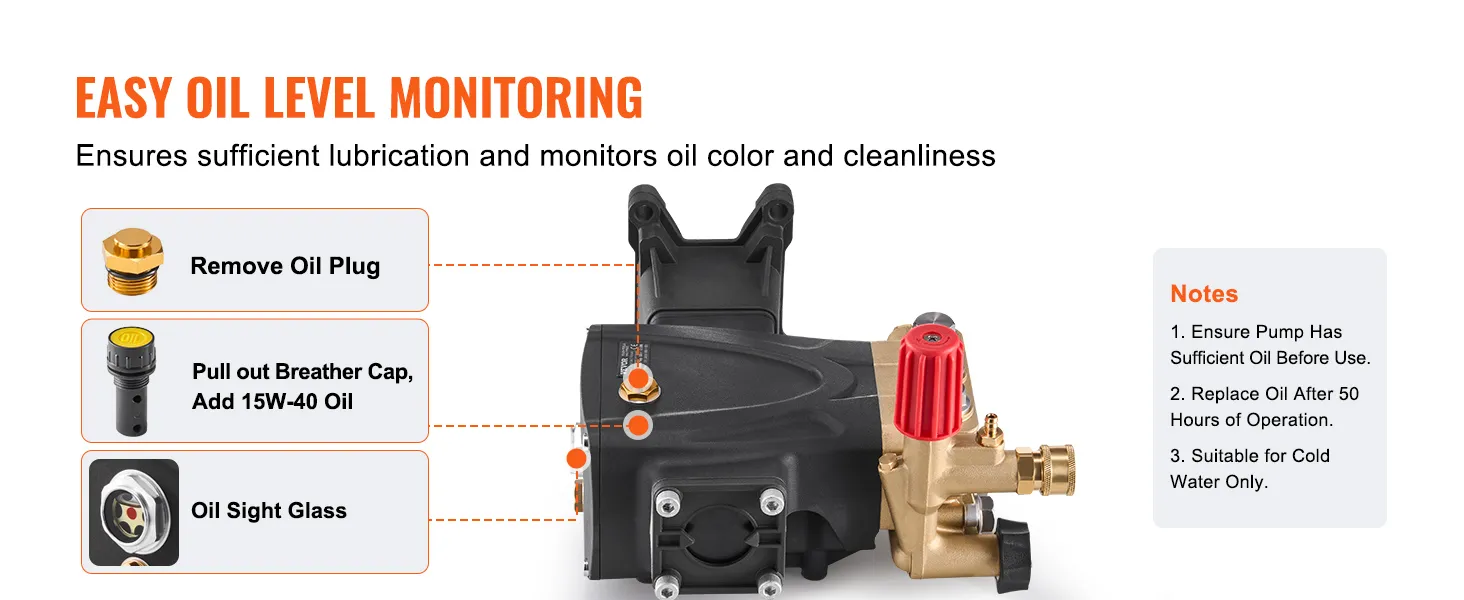 Eenvoudig onderhoud: dankzij een geïntegreerd oliekijkglas kunt u het oliepeil controleren zonder het apparaat te demonteren. Hierdoor kunt u snel olietekorten of vervuilingen identificeren en de pomp in topconditie houden. Om de levensduur te verlengen en voortdurende efficiëntie te garanderen, raden wij aan de olie elke 60 gebruiksuren te verversen. Opmerking: Deze vervangingspomp voor hogedrukreinigers is uitsluitend bedoeld voor gebruik met koud water.