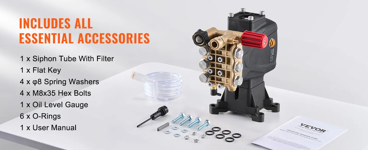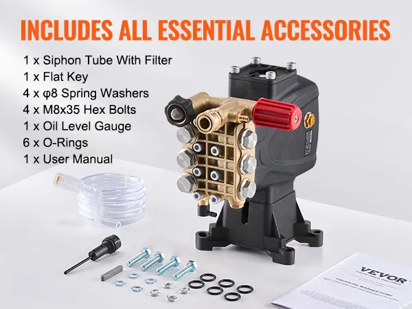 Bij deze vervangingspomp voor de hogedrukreiniger wordt een complete set montageaccessoires geleverd. Zo vervang je snel en eenvoudig de originele pomp en geef je je hogedrukreiniger een nieuw leven.
