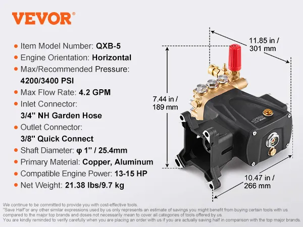 VEVOR Pressure Washer Pump, 1" Shaft Horizontal Triplex Plunger, 4200 PSI, 4.2GPM, Replacement Power Washer Pumps Kit with 5 Nozzles, Compatible with Simpson MorFlex 40224, 40225, 40226, Santoprene VEVOR Pressure Washer Pump, 1" Shaft Horizontal Triplex Plunger, 4200 PSI, 4.2GPM, Replacement Power Washer Pumps Kit with 5 Nozzles, Compatible with Simpson MorFlex 40224, 40225, 40226, Santoprene