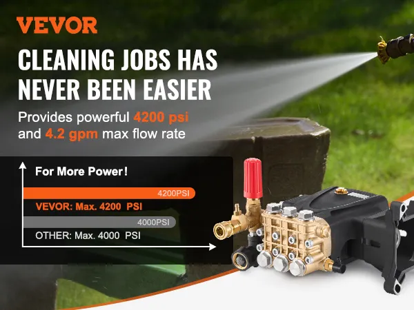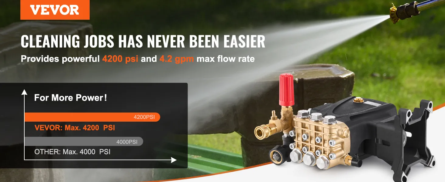 • High-Efficiency Cleaning Power: Our pressure washer pump delivers up to 4200 PSI of powerful water pressure with a maximum flow rate of 4.2 GPM, ensuring fast completion of tasks ranging from household cleaning to light industrial jobs. (Recommended working pressure: 3400 PSI for typical residential and light industrial cleaning and to extend pump life.)