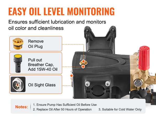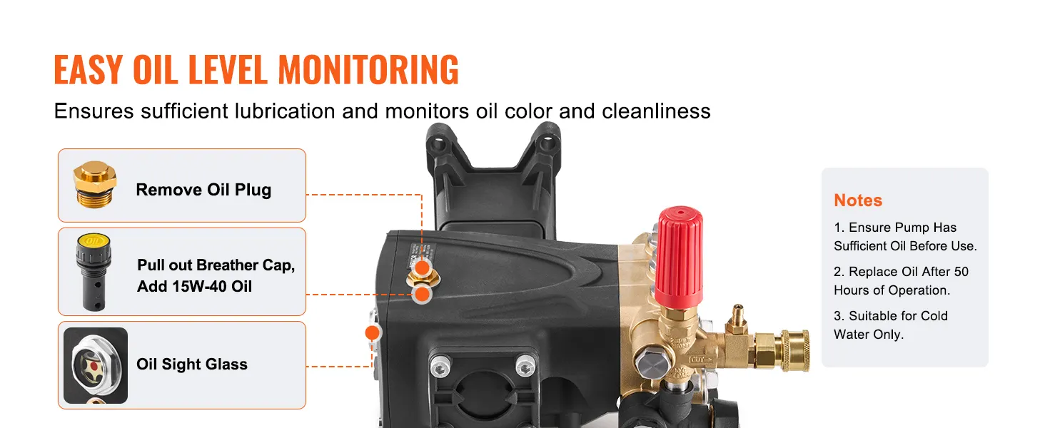• Easy Maintenance: An integrated oil sight glass lets you check oil levels without disassembling the unit, helping detect low oil or contamination promptly to keep the pump in peak condition. To extend lifespan and ensure continuous efficiency, we recommend changing the oil every 60 hours of operation. Note: This replacement pump for power washer is intended for use with cold water only.