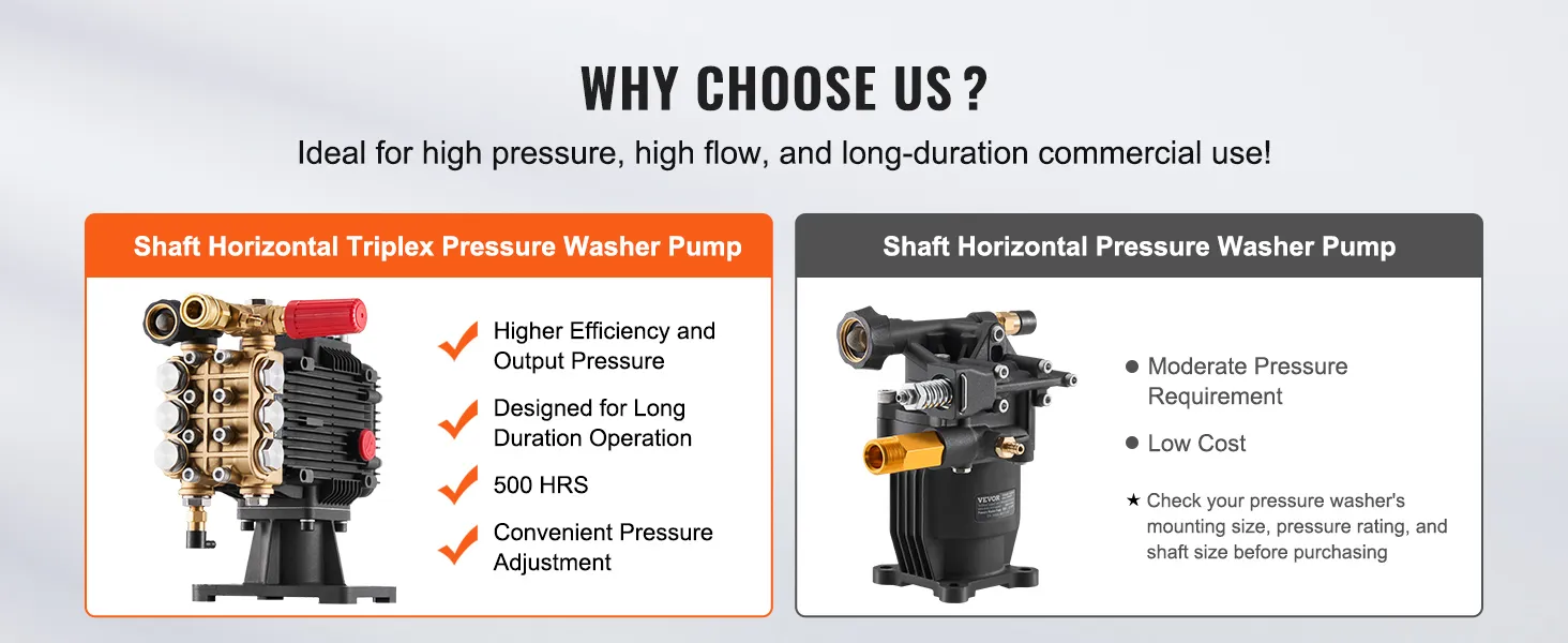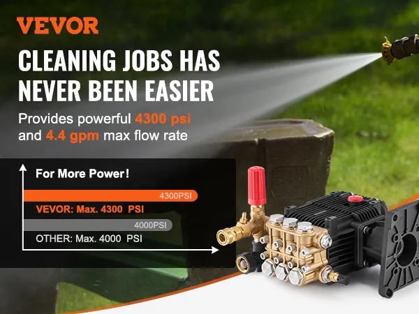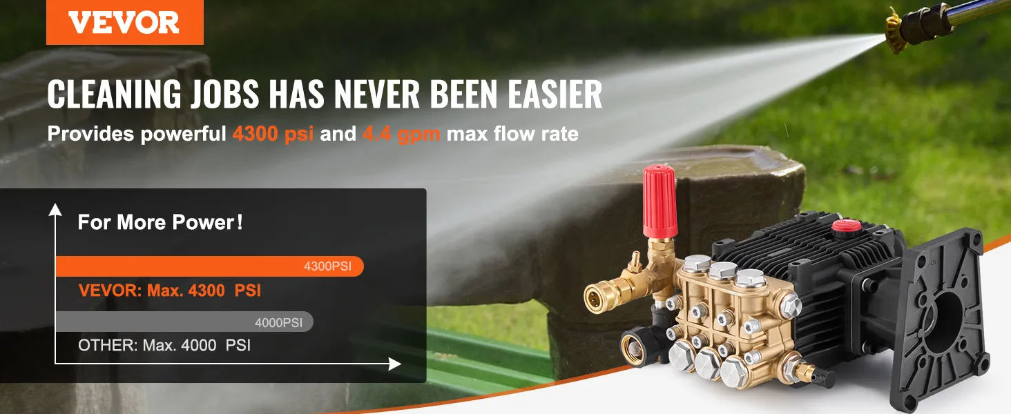 Zeer efficiënte reinigingsprestaties: onze hogedrukreinigerpomp levert een krachtige waterdruk tot 4300 PSI bij een maximale stroomsnelheid van 4,4 GPM, waardoor een snelle voltooiing van taken wordt gegarandeerd, van huishoudelijke schoonmaak tot licht industriële klussen. (Aanbevolen werkdruk: 3700 PSI voor typische huishoudelijke en licht industriële reiniging en om de levensduur van de pomp te verlengen.)