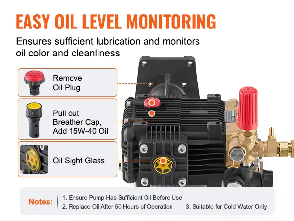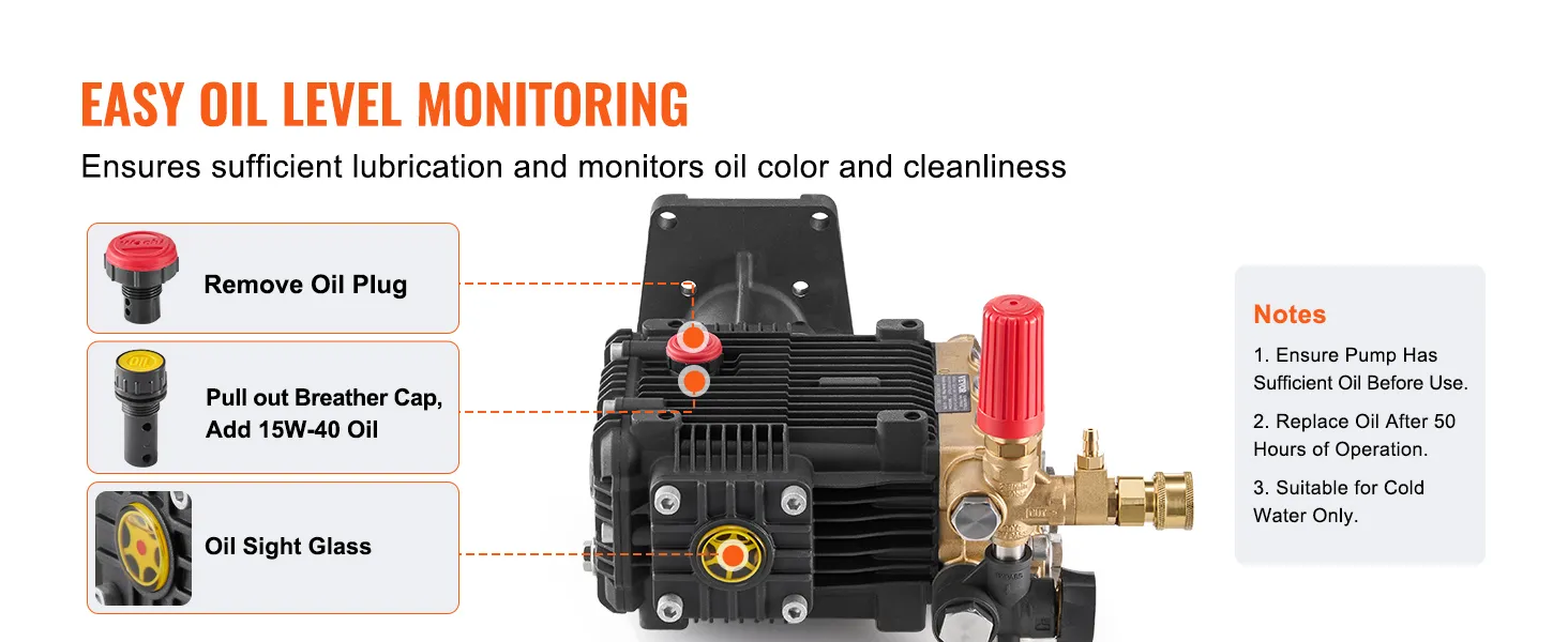 Eenvoudig onderhoud: dankzij een geïntegreerd oliekijkglas kunt u het oliepeil controleren zonder het apparaat te demonteren. Hierdoor kunt u snel olietekorten of vervuilingen identificeren en de pomp in topconditie houden. Om de levensduur te verlengen en voortdurende efficiëntie te garanderen, raden wij aan de olie elke 60 gebruiksuren te verversen. Opmerking: Deze vervangingspomp voor hogedrukreinigers is uitsluitend bedoeld voor gebruik met koud water.