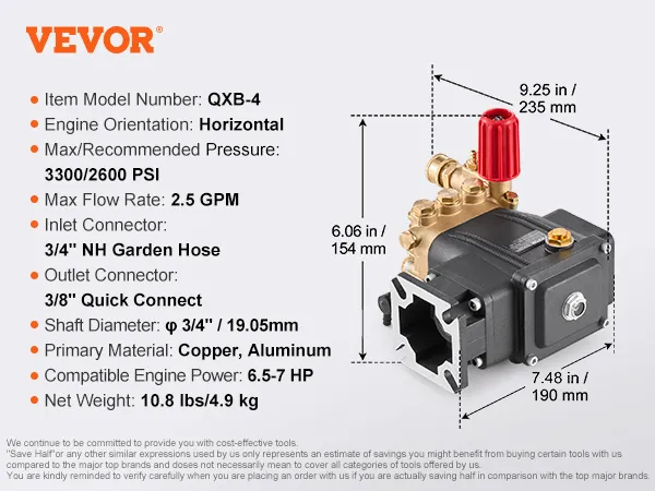 Broad Compatibility: Featuring a standard SAE bolt pattern, this power washer pump is compatible with various horizontal engine pressure washers, including Simpson MorFlex models 40224, 40225, 40226, and Santoprene model 41182. Match engine orientation, PSI, GPM, engine shaft diameter, and current pump inlet/outlet connections to ensure compatibility.