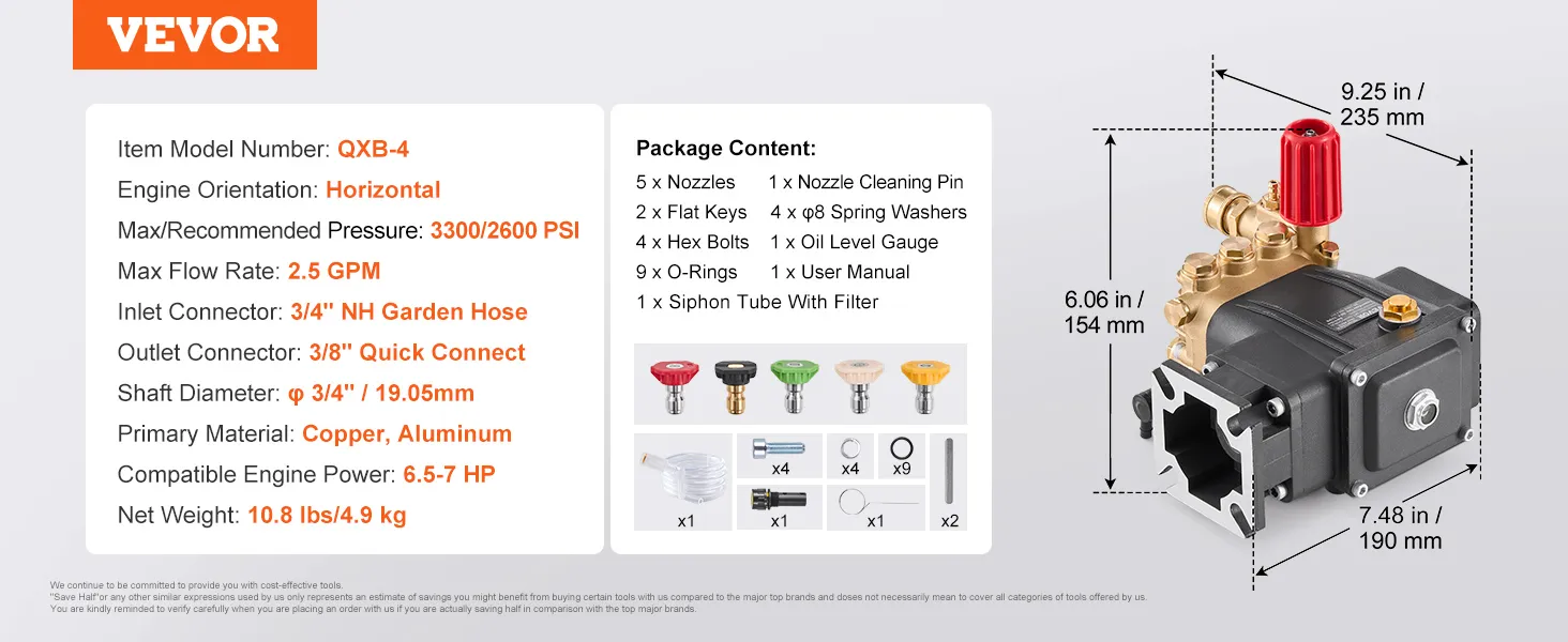 Equipped with a variety of nozzles and complete installation hardware, this replacement pump for power washer is adaptable to diverse cleaning tasks and environments, enhancing its versatility and usability.