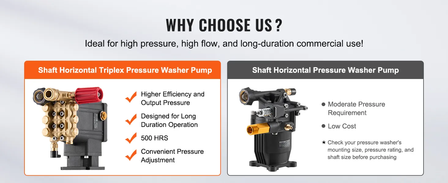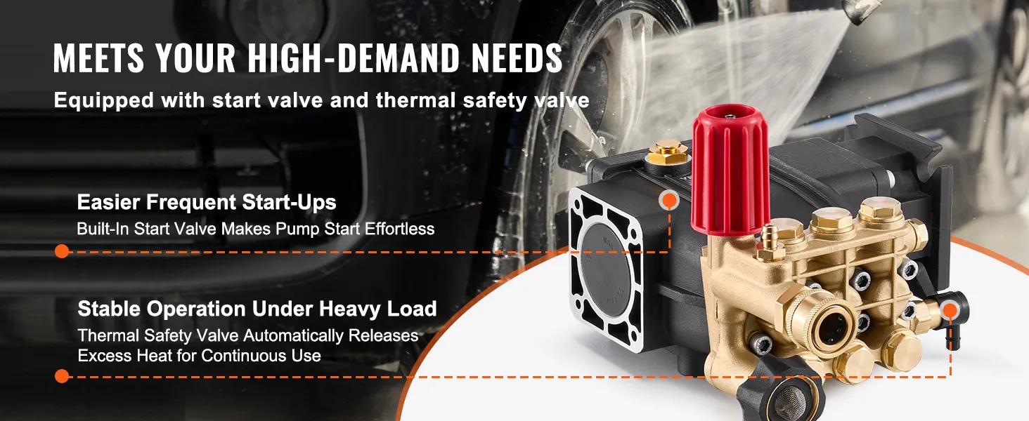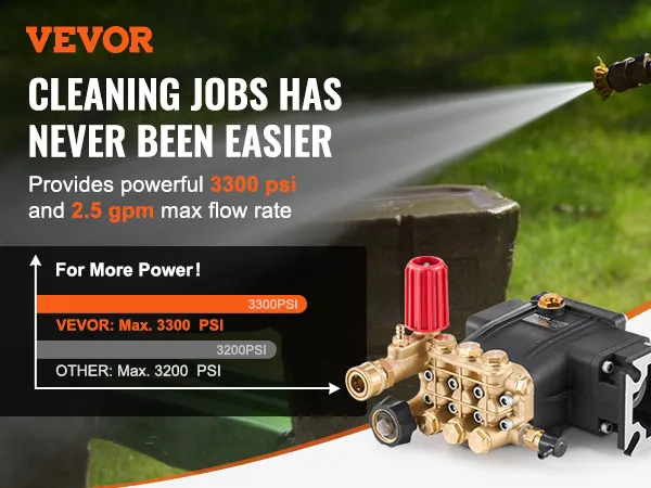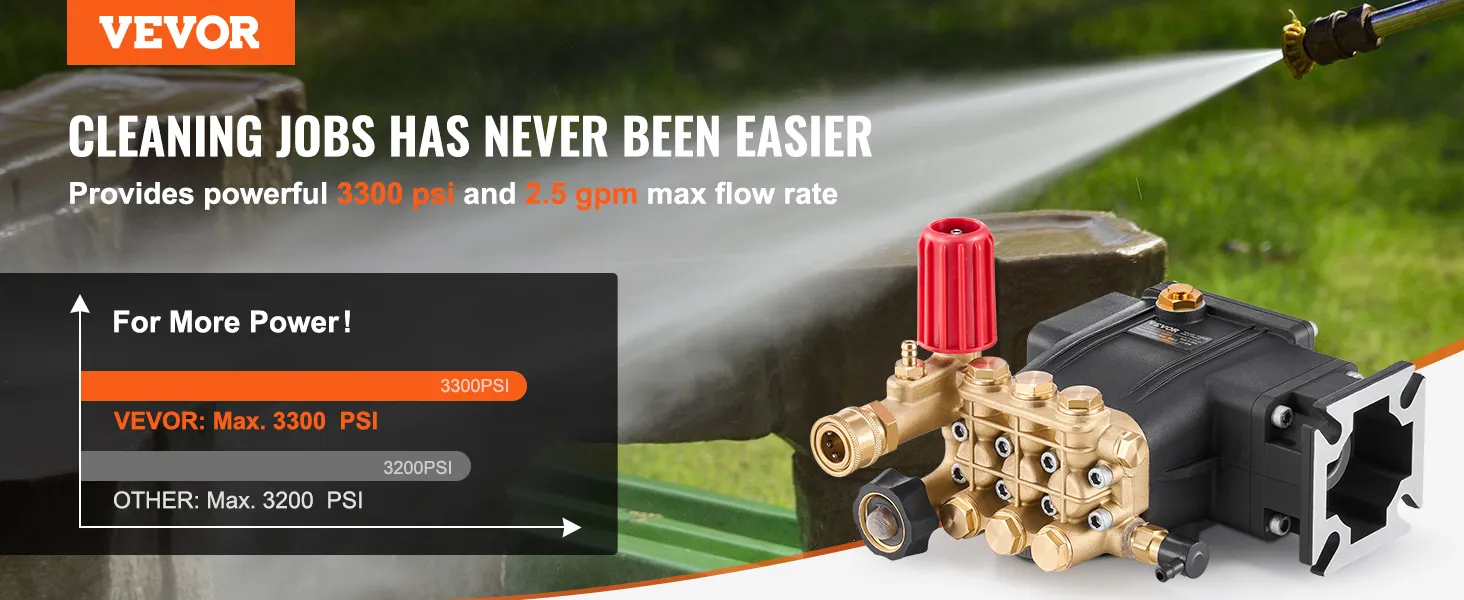 High-Efficiency Cleaning Power: Our pressure washer pump delivers up to 3300 PSI of powerful water pressure with a maximum flow rate of 2.5 GPM, ensuring fast completion of tasks ranging from household cleaning to light industrial jobs. (Recommended working pressure: 2600 PSI for typical residential and light industrial cleaning and to extend pump life.)