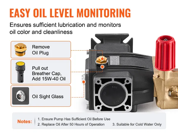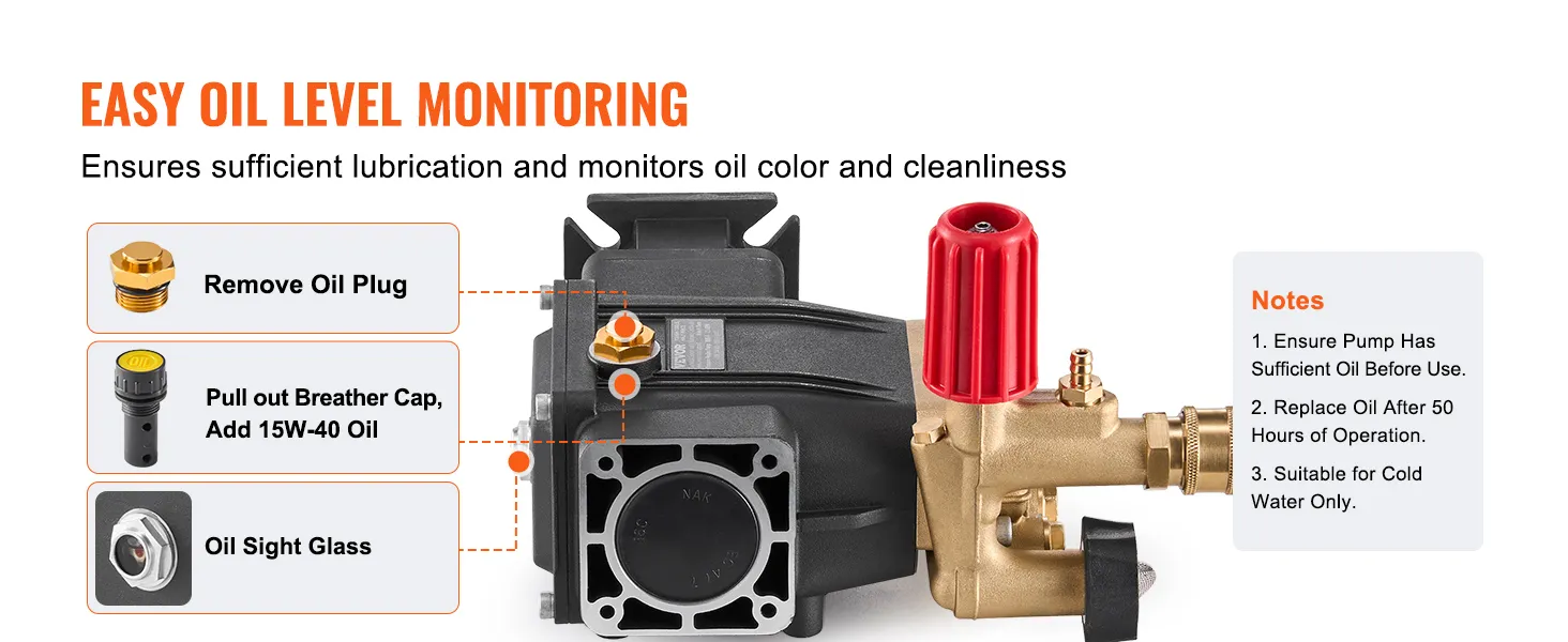 Easy Maintenance: An integrated oil sight glass lets you check oil levels without disassembling the unit, helping detect low oil or contamination promptly to keep the pump in peak condition. To extend lifespan and ensure continuous efficiency, we recommend changing the oil every 60 hours of operation. Note: This replacement pump for power washer is intended for use with cold water only.