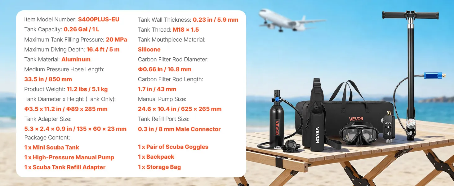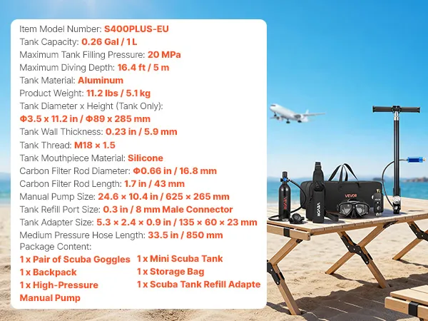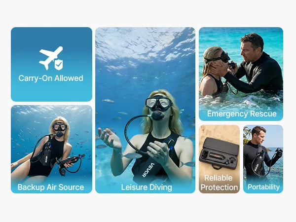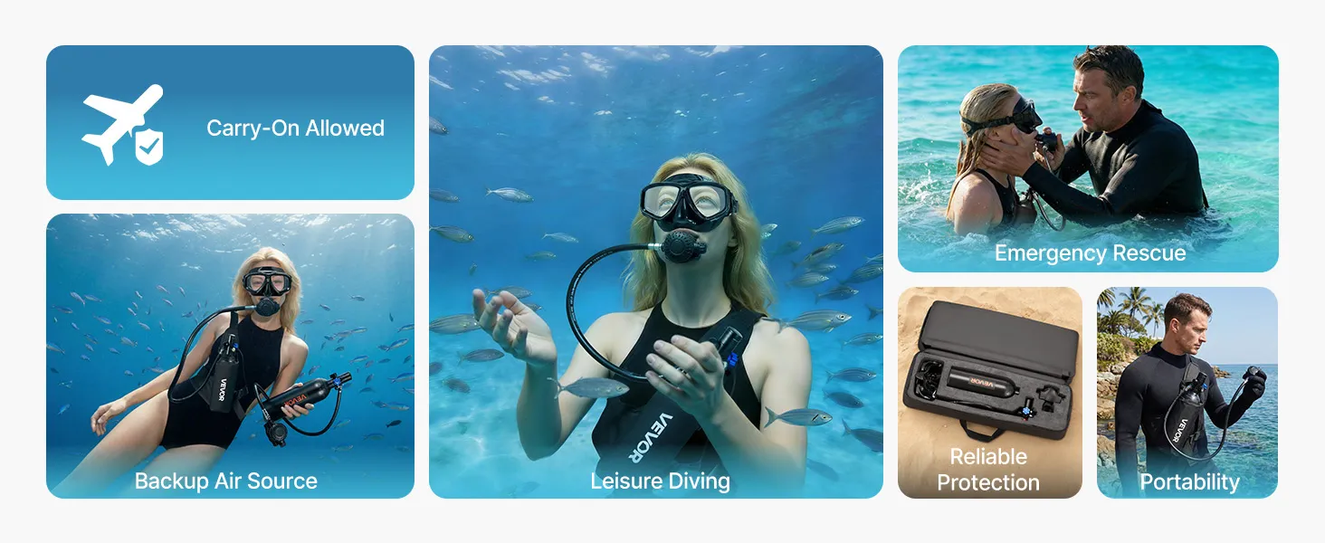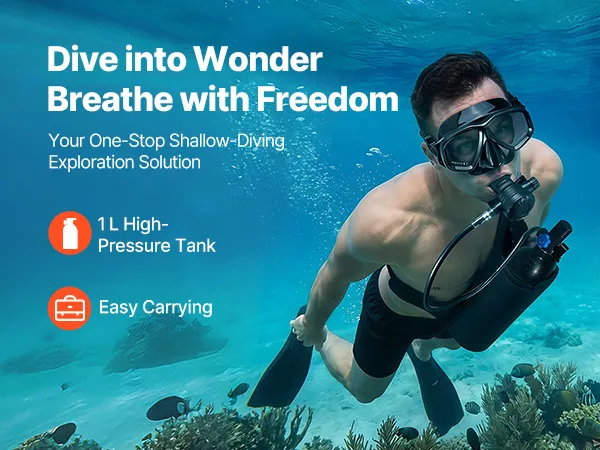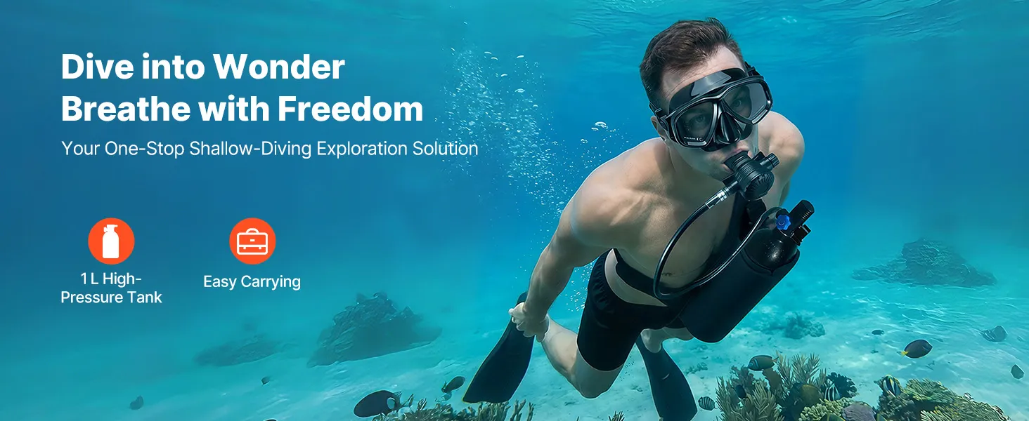 Complete duikset: De miniduikfles van 1 liter (0,26 gallon), in combinatie met het duikmasker, maakt een onderwaterademhalingstijd van ongeveer 15 tot 20 minuten mogelijk op een diepte tot 5 meter (16,4 voet). De set is geschikt voor snorkelen, het verkennen van ondiepe wateren en voor noodgevallen.