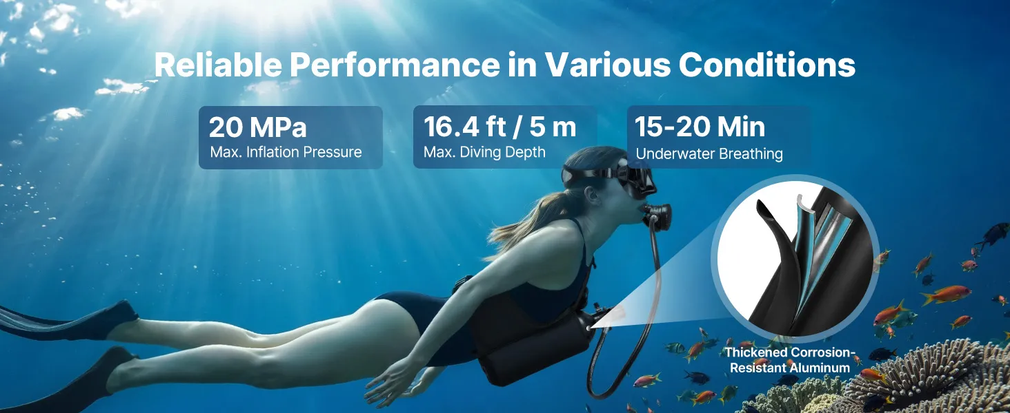 Versterkte tank en ventiel: Onze longvormige luchtcilinder is ontworpen voor gebruik onder water, vervaardigd uit aluminium van ruimtevaartkwaliteit en geschikt voor drukken tot 20 MPa. Het verbeterde ademventiel en de externe explosieveilige schijf zorgen voor een constante luchtstroom en betrouwbare prestaties in ondiep water.