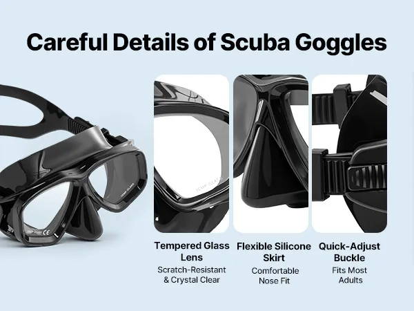 Breed en helder gezichtsveld: De duikfles is voorzien van een lens van gehard glas met een anticondenscoating, die een gezichtsveld van 180° biedt. De zeer elastische siliconenrand sluit nauw aan op het gezicht om te voorkomen dat er water binnendringt en zorgt voor comfortabel dragen.