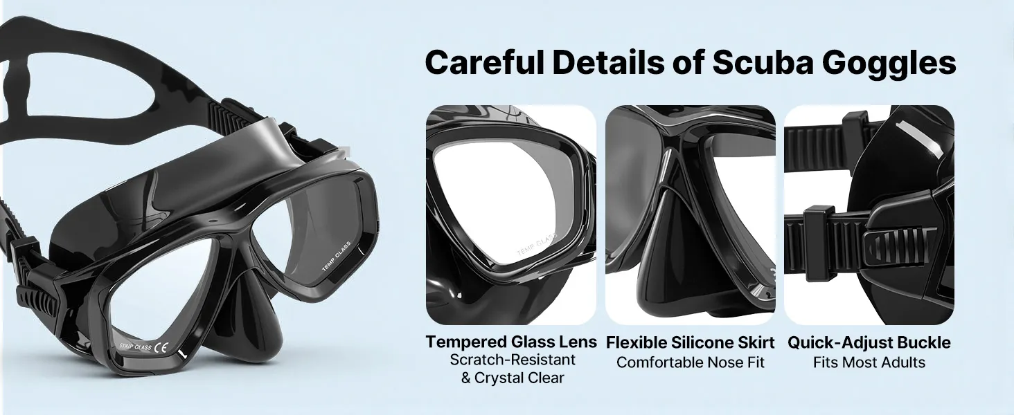 De longvormige luchttank combineert een lens met duurzame anticondenstechnologie voor helder zicht van begin tot eind. De zeer elastische siliconenrand past zich aan verschillende gezichtsvormen aan en zorgt voor een comfortabele, lekvrije afsluiting – voor een meeslepende onderwaterervaring.