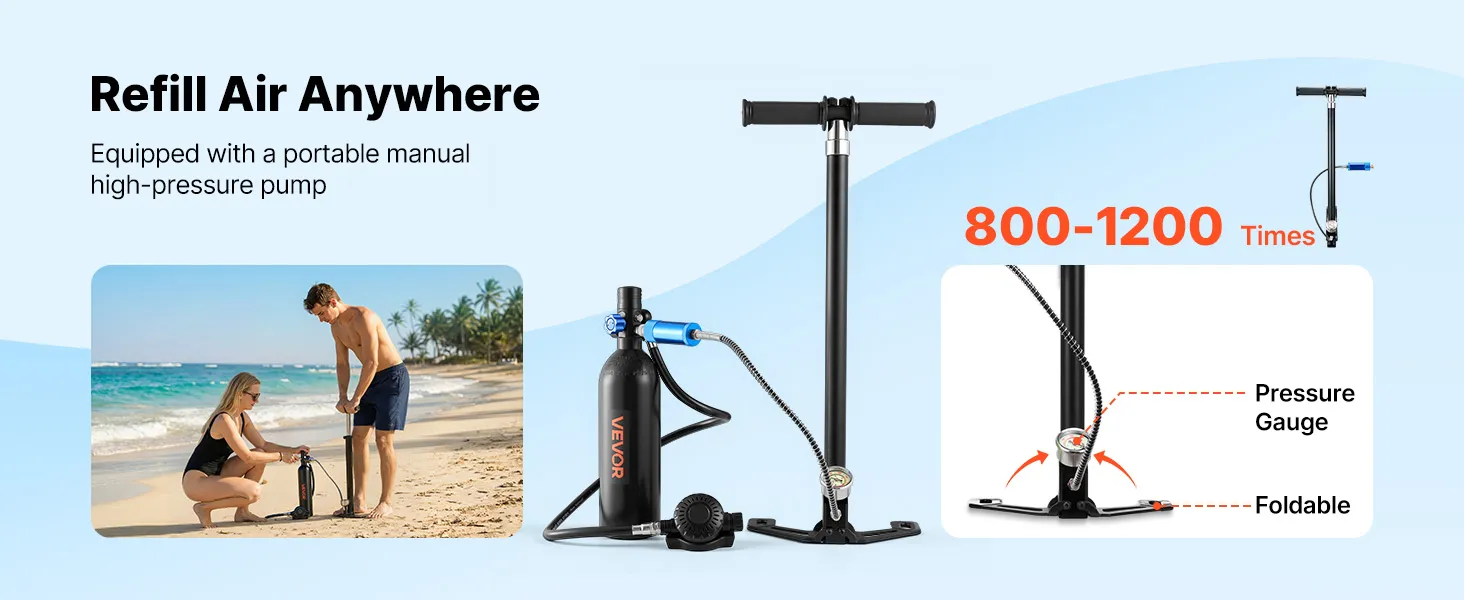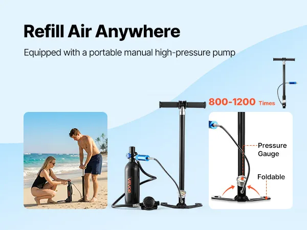 De duikflesset bevat een opvouwbare hogedrukhandpomp waarmee de fles snel kan worden bijgevuld – slechts 400-600 pompbewegingen zijn nodig! Dankzij de duikflesadapter is bijvullen ook eenvoudig mogelijk in professionele duikwinkels.