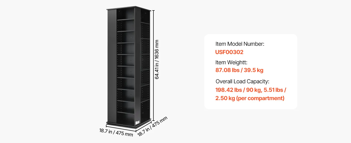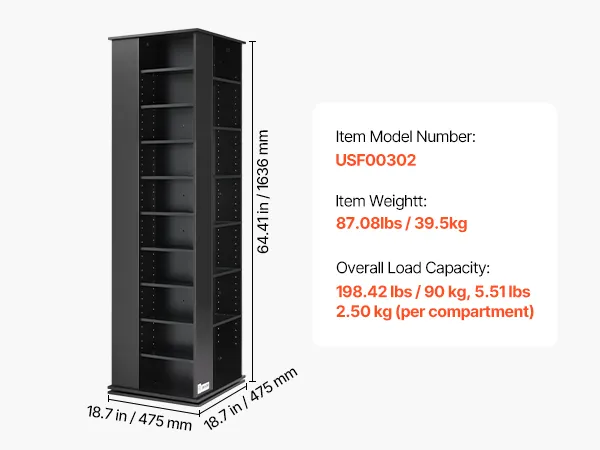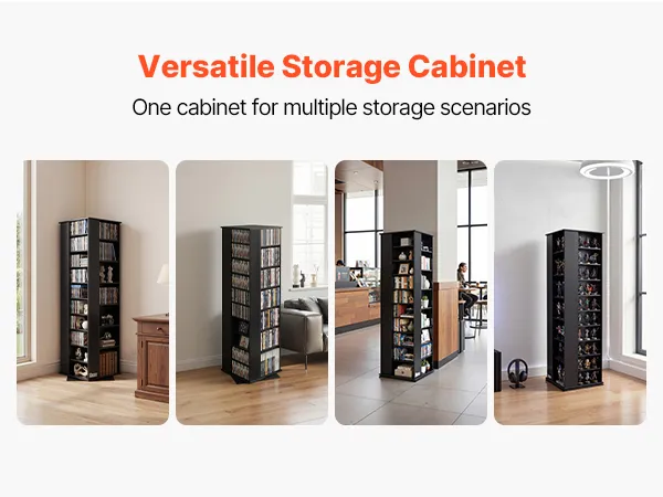 VEVOR draaibare dvd-plank met 34 vakken, verstelbare mediaplank, vrijstaande plank 475 x 475 x 1636 mm, ruimtebesparende opbergplank voor cd's, dvd's, boeken, game discs, woonkamer, thuiskantoor, zwart