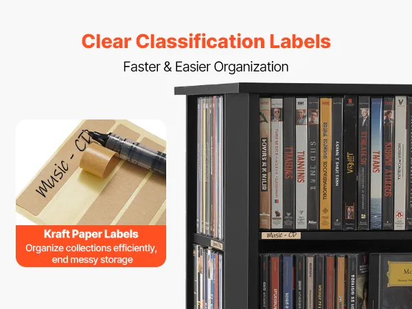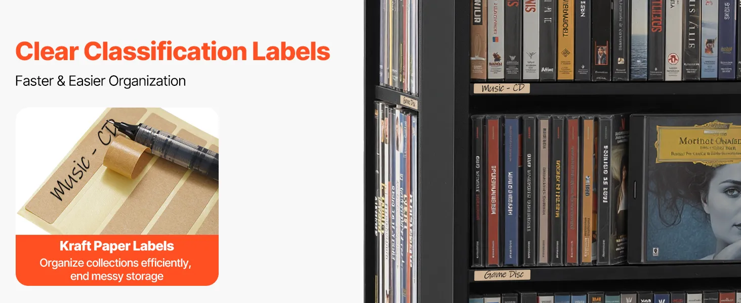 Overzichtelijke opbergruimte: Dit cd-rek wordt geleverd met etiketten van kraftpapier, zodat u elk vakje afzonderlijk kunt labelen. Zo heeft u uw collectie altijd in het zicht en is uw mediacollectie altijd netjes georganiseerd.