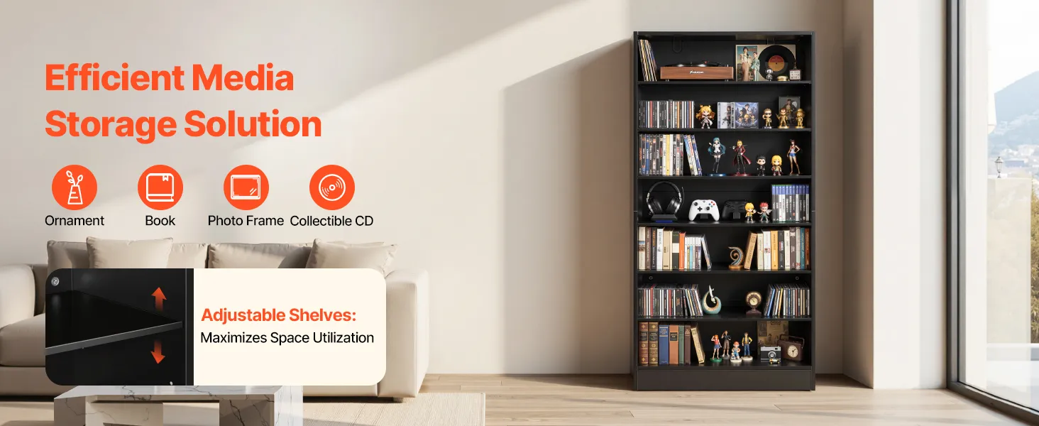 Flexible Storage: Our media storage cabinet features adjustable shelves, customizing shelf height to fit items of different sizes. Easily adapt the layout to your collections, maximizing space while keeping everything neatly organized and displayed