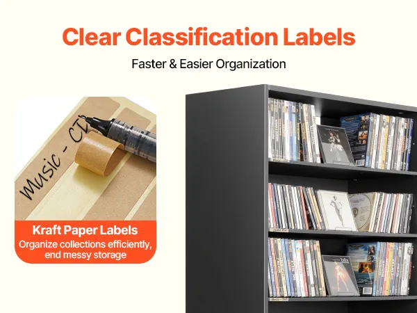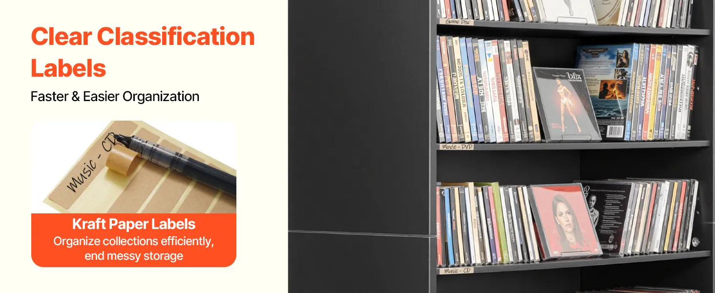 Clear & Organized Storage: This CD cabinet includes kraft paper labeling stickers, so you can mark each compartment your way. Easily sort and identify collectibles at a glance, keeping your media collection neatly organized at all times