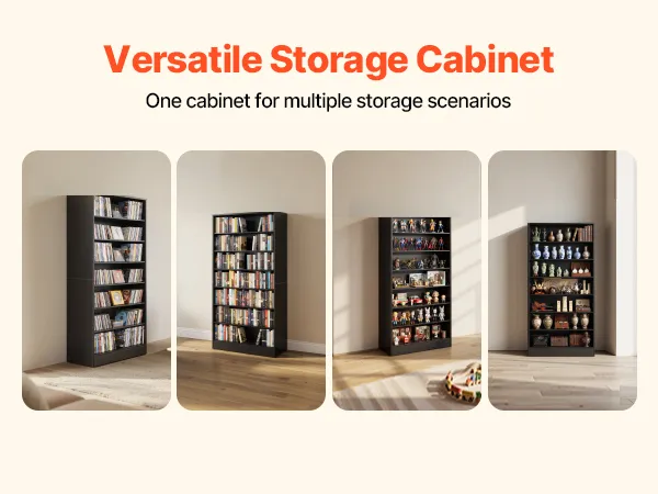 Our media storage cabinet features innovative adjustable shelves, allowing you to tailor the interior height as needed, maximizing storage efficiency while securely keeping your treasured collectibles organized and displayed.