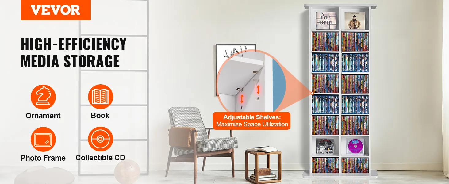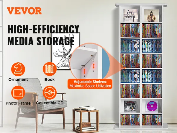 VEVOR Media Storage Cabinet, 8-layer DVD Shelf Holds up to 464 CDs, Adjustable CD Shelves 16 Compartments, Protects & Organizes Music, Movie, Video Games or Memorabilia Collections, White