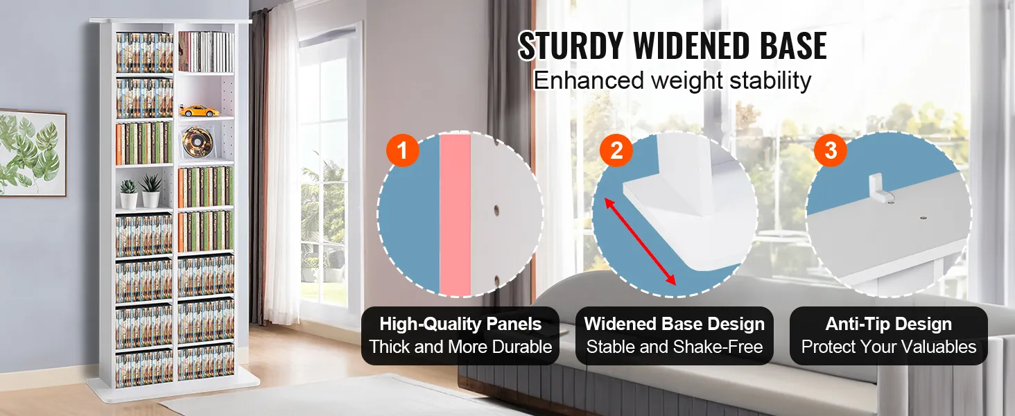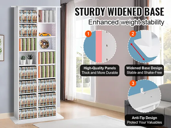 Stable Design: Our DVD shelf is equipped with a widened base for enhanced stability, preventing wobbling. It includes an anti-tip design to secure against accidental bumps, ensuring your collection remains safe during everyday use.