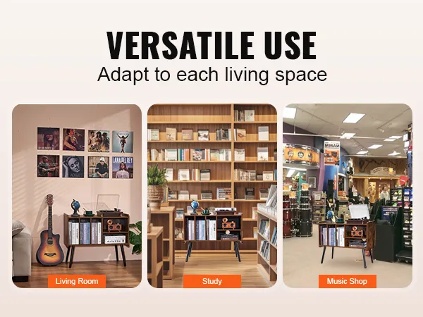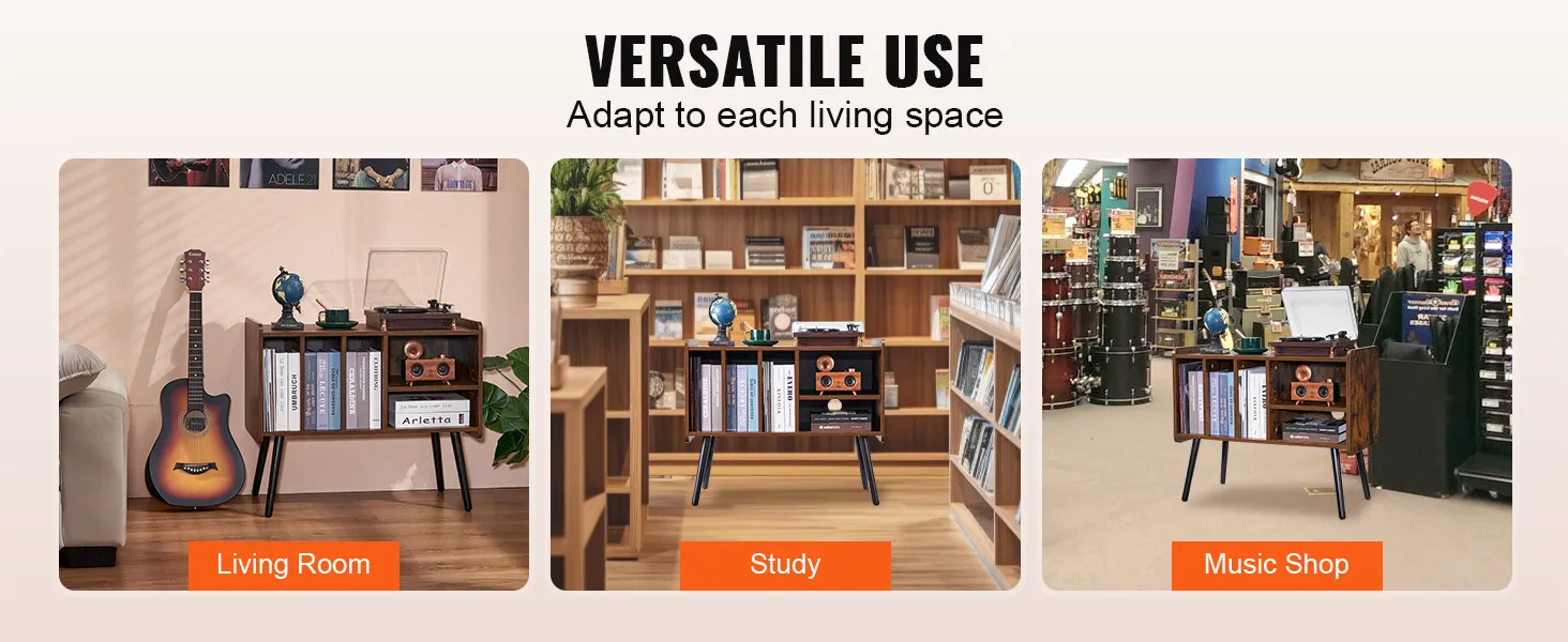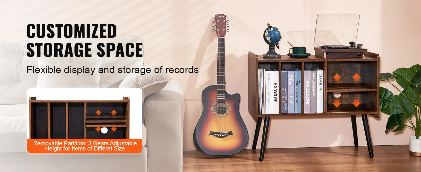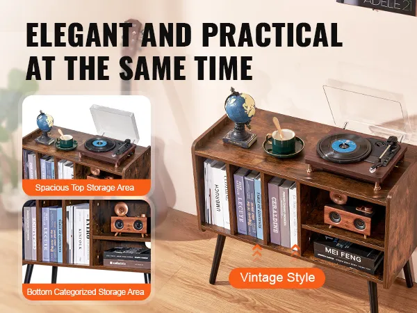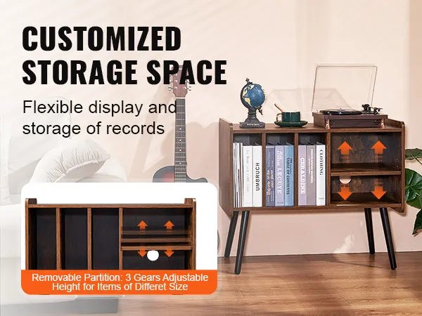 Adjustable Shelves: This record player stand features adjustable shelving design, providing flexible storage options to easily categorize and organize your music treasures.