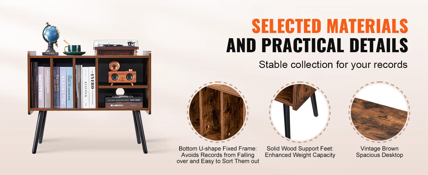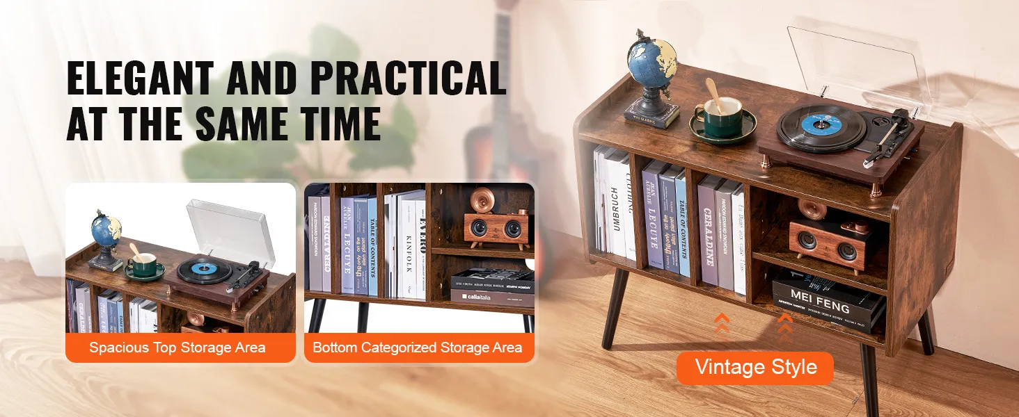 Durable and Attractive: The retro brown panels, combined with solid wood support legs, offer not only aesthetic appeal but also durability, ensuring the stand’s stability and long-lasting use. This wood record player stand is both beautiful and functional, designed to withstand years of enjoyment.