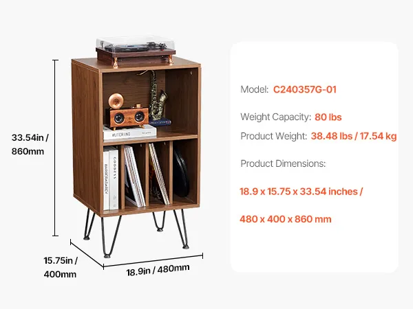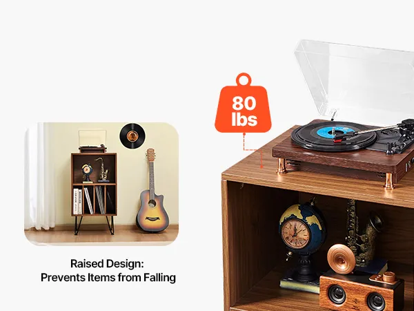 The vintage brown partitions add a touch of character, while the record player shelf can hold up to 80 lbs, providing reliable support for your turntable and records.