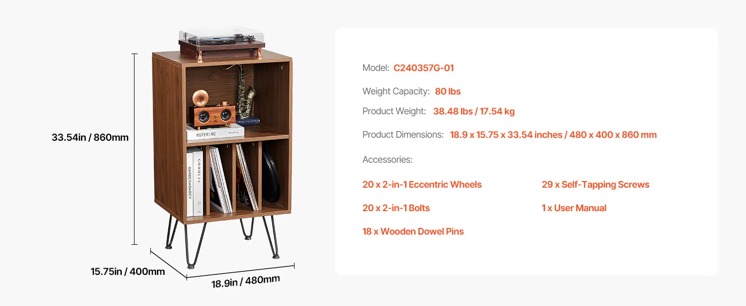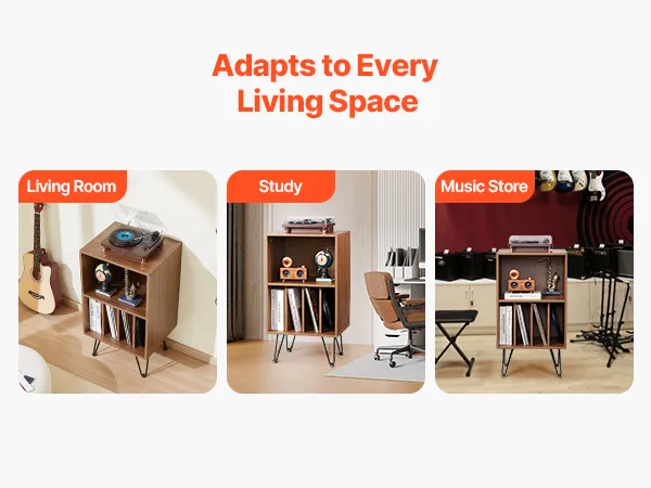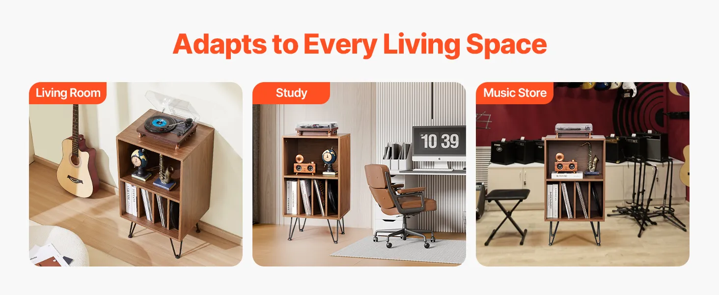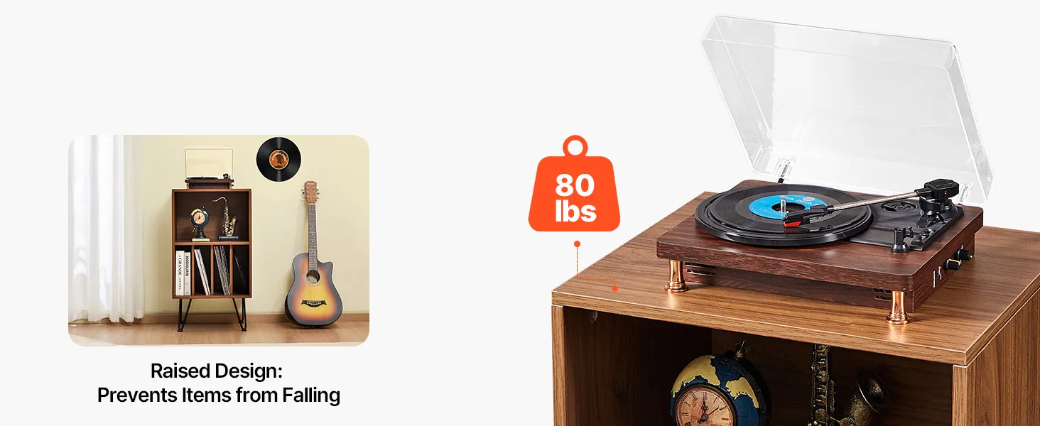 Sturdy and Reliable Materials: Made with waterproof and scratch-resistant panels, this record holder stand offers a solid structure and strong weight capacity. Built to last, it resists deformation and wobbling over time, so you can enjoy worry-free use without needing to replace furniture frequently.