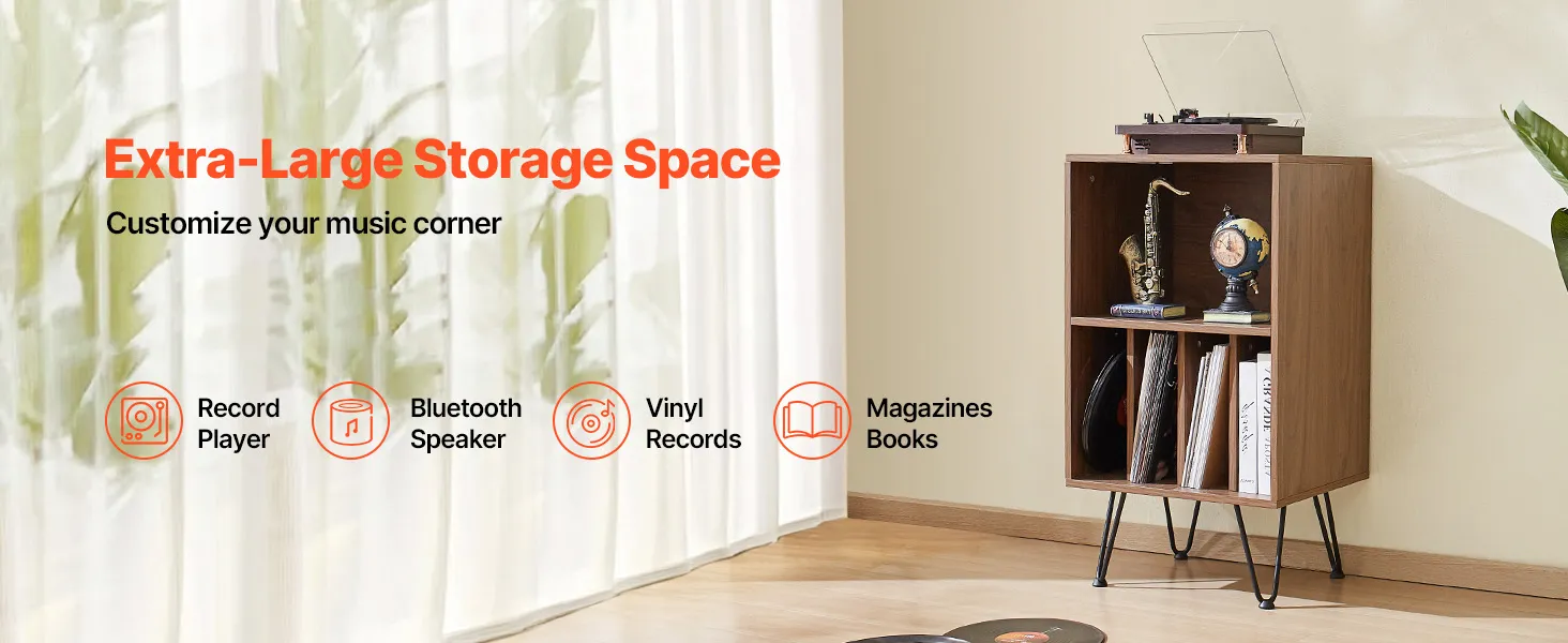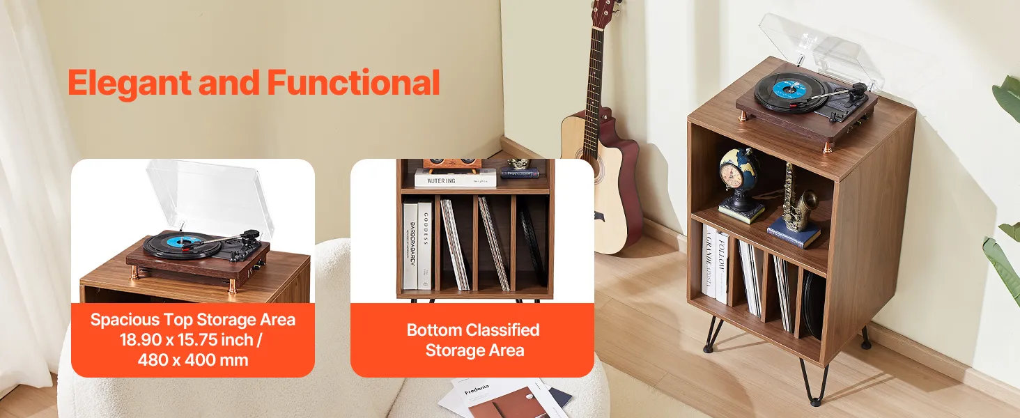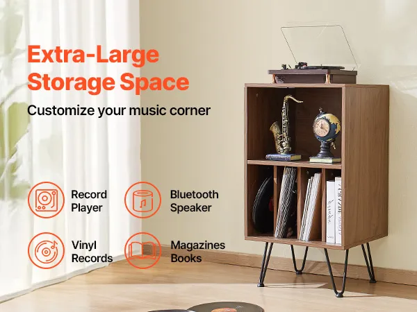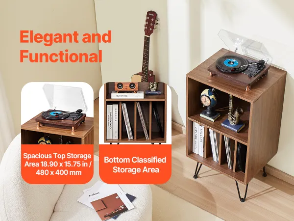 Elegant Display: The spacious record player stand maximizes space. Keep your music collection neat and accessible with this stylish record player stand!