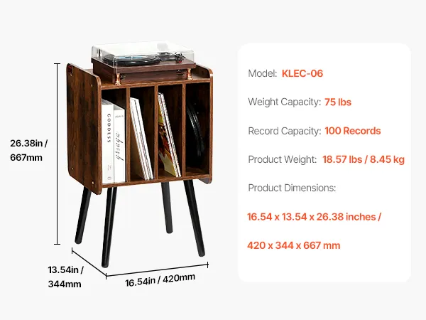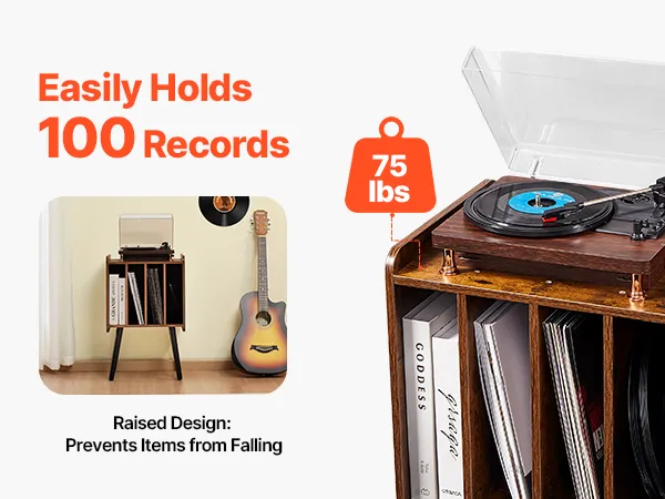The vintage brown partitions add a touch of character, while the record player shelf can hold up to 75 lbs, providing reliable support for your turntable and records.