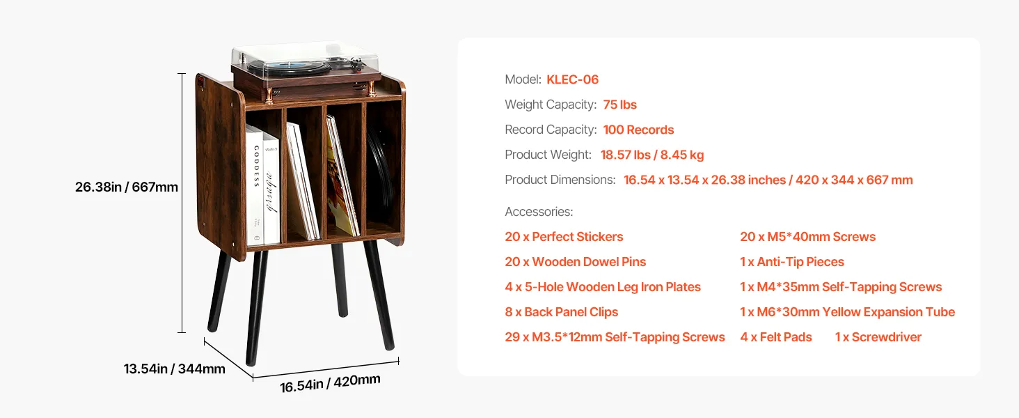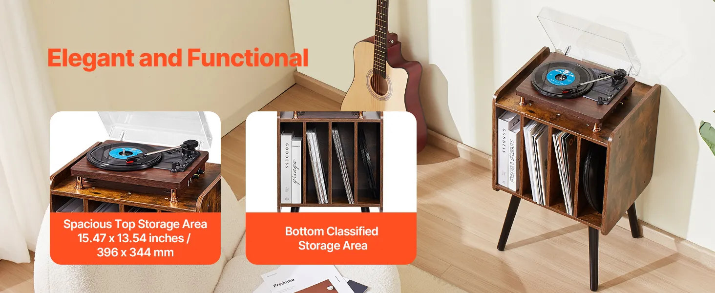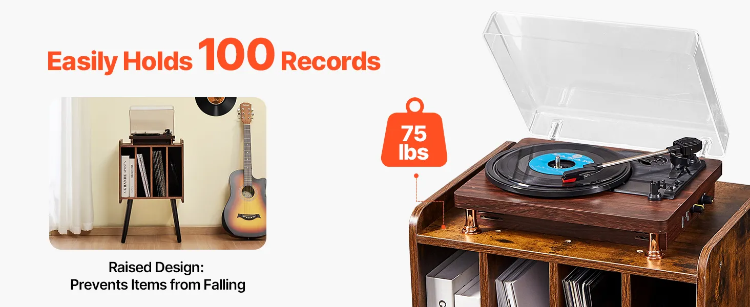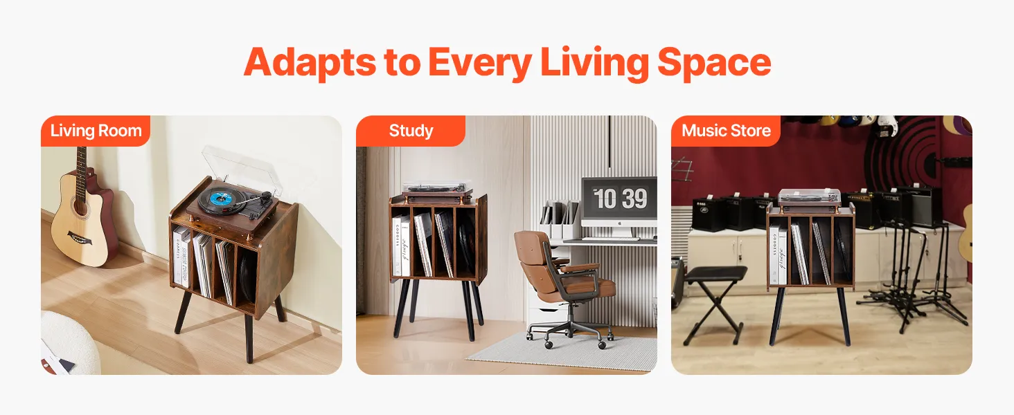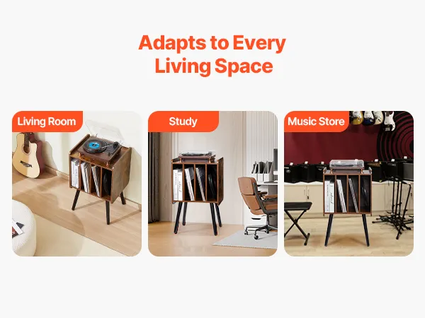 Sturdy and Reliable Materials: Made with waterproof and scratch-resistant panels, this record holder stand offers a solid structure and strong weight capacity. Built to last, it resists deformation and wobbling over time, so you can enjoy worry-free use without needing to replace furniture frequently.